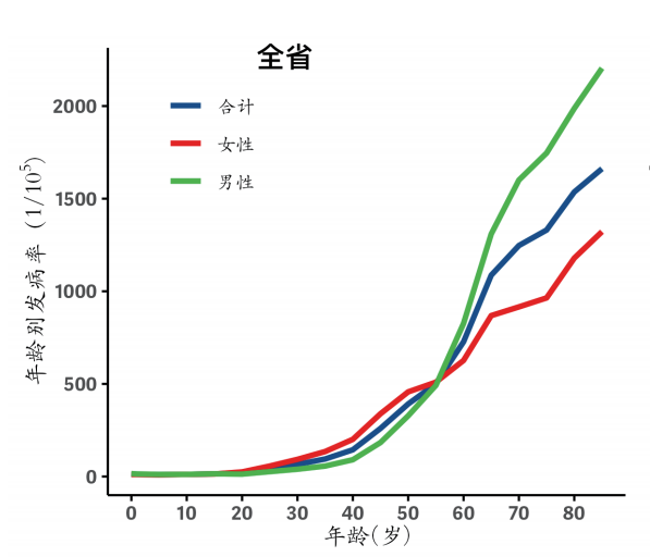 不同的癌种具有不同的年龄变化特征,比如肺癌在40岁之前发病率相对平稳,而之后则快速上升,在85岁年龄组人群中达到峰值;前列腺癌从60岁开始快速上升,在85岁年龄组人群中达到峰值;乳腺癌、甲状腺癌的发病高峰则在50岁左右。