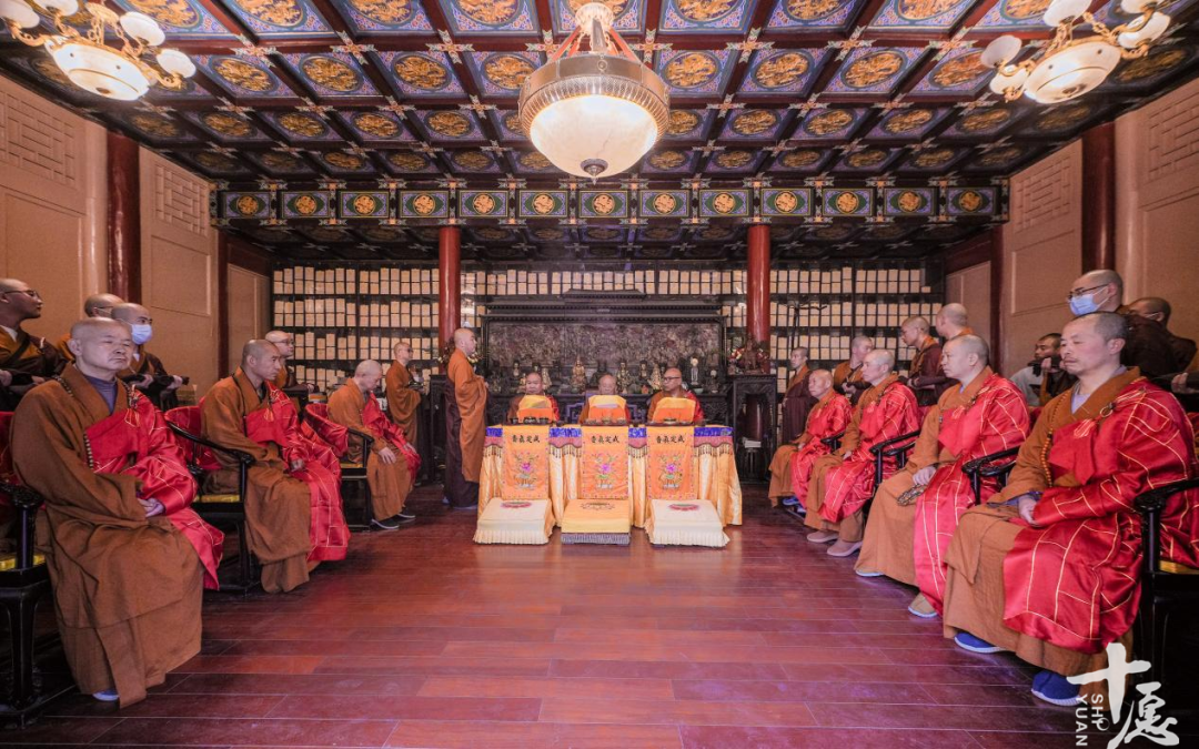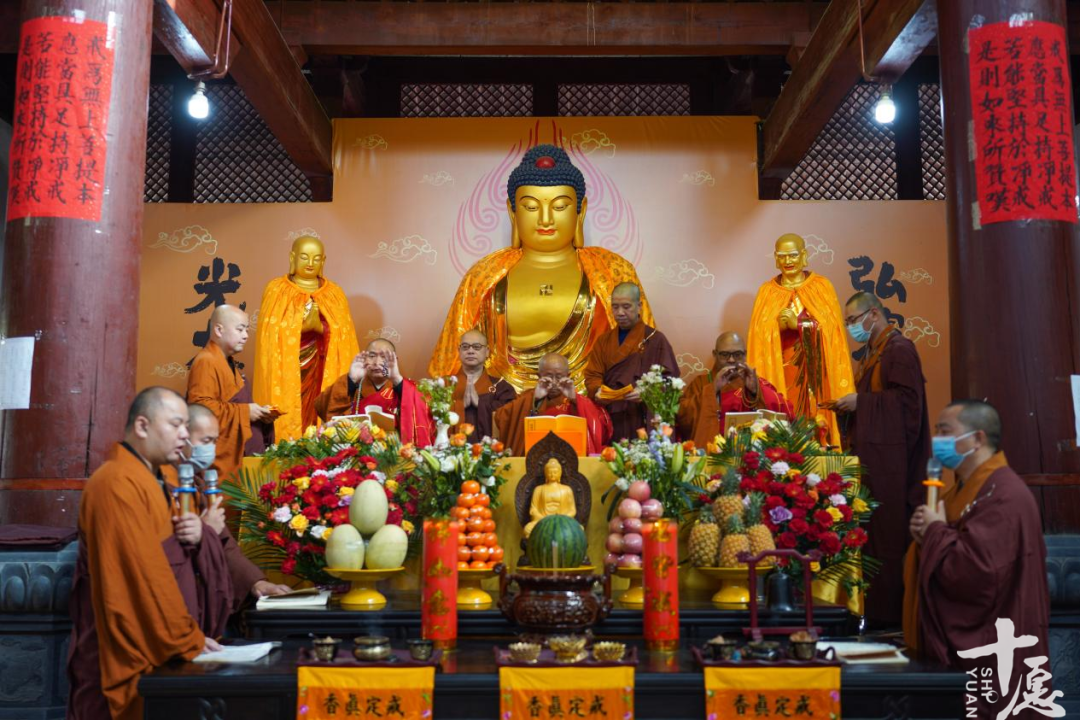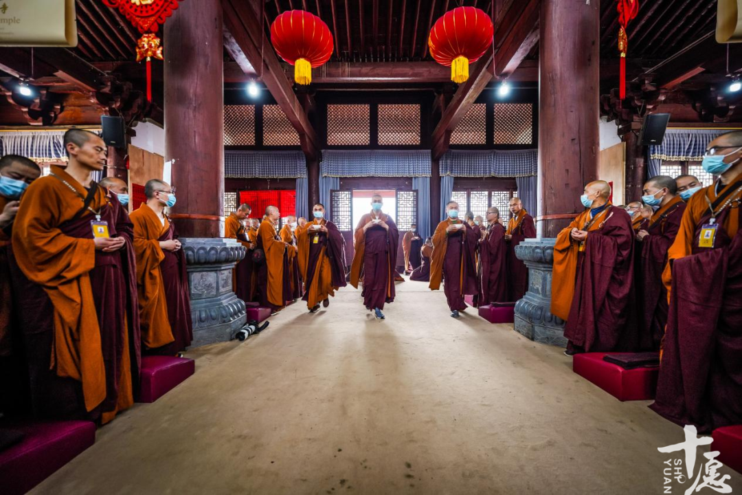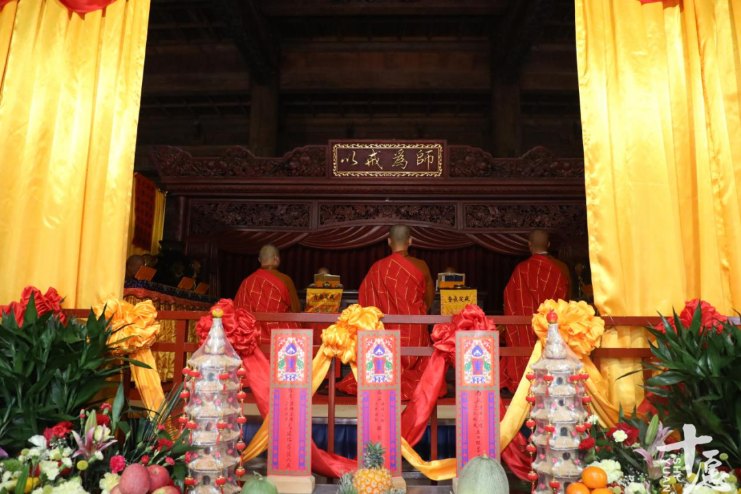 在诸位引礼师父的带领下,以幢、幡、提炉等庄严仪仗为先导,众沙弥将十师恭请至真觉戒坛,登比丘戒。随后,诸位引礼师父带领众沙弥奉请三宝及诸龙天护法等,证盟受戒,监坛护戒。