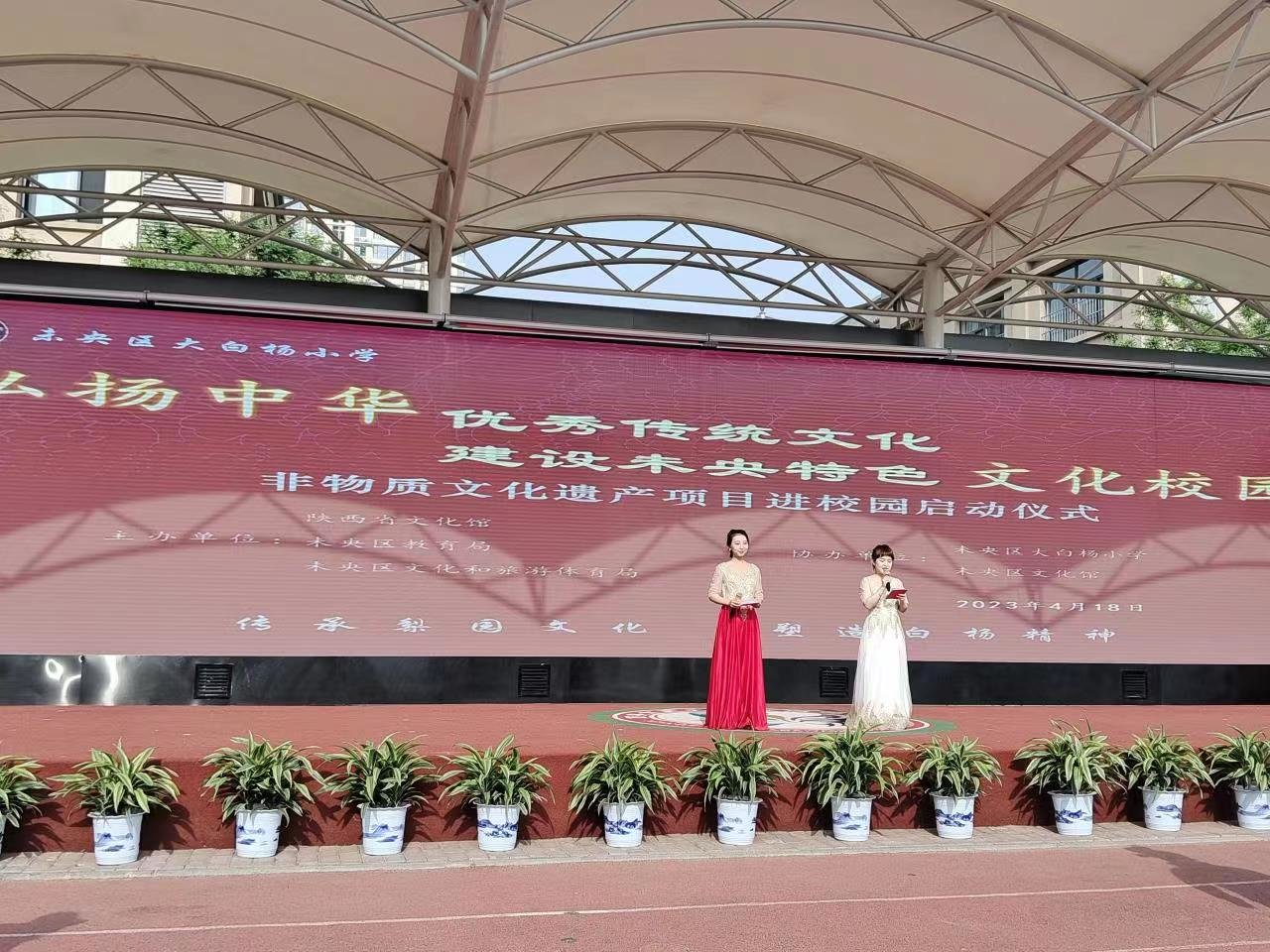 2023年4月18日,西安市未央区“弘扬中华优秀传统文化 建设未央特色文化校园——非物质文化遗产项目进校园”启动仪式在未央区大白杨小学顺利举行。本次活动由未央区教育局、未央区文化和旅游体育局、陕西省文化馆联合主办,由未央区文化馆、未央区大白杨小学承办。陕西省非遗保护中心主任、省文化馆党总支副书记杜俊杰、未央区教育局正处级二级调研员杨晓东、未央区文化和旅游体育局党委书记张峰、未央区文化馆党支部书记习涛、未央区大白杨小学党支部书记、校长潘涛及未央区部分中小学校长参加了活动。