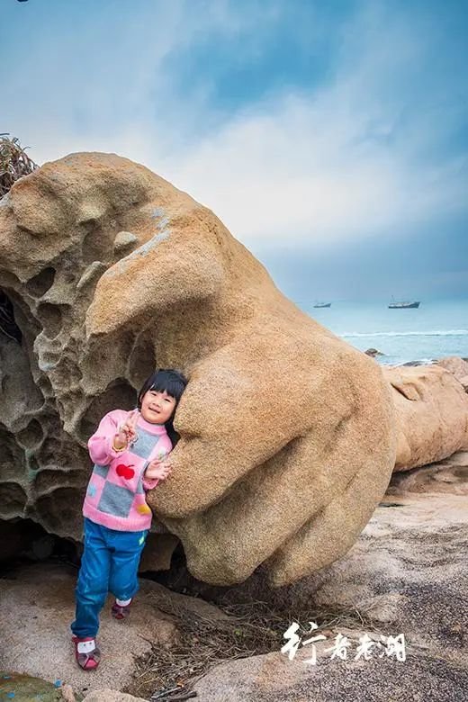 从码头上岸后,沿灯塔左边的情侣路可以走到海滨浴场。水清石奇,有摩崖石刻、钓鱼台、玉带环腰、海螺奇石、金石公园等等,还能看到碉堡。巨大的岩石被时间打磨得浑圆,遇到风高浪急,海水会激起一米多高的白色浪花。不少岩石造型奇特,有一只巨人的大手,人可以在掌心拍照,十分有趣。