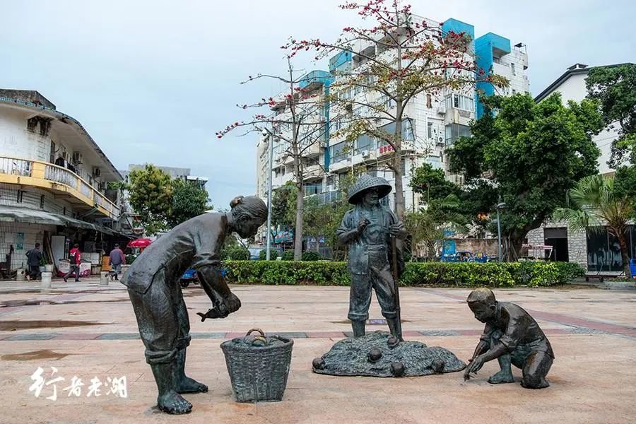 轮渡码头上岸直行便是担杆镇,走到大街再往右行,就是伶仃湾广场。一只小狗懒洋洋坐在广场上,一个孩子趴在渔民塑像上玩耍,时光仿佛凝固。一座拱桥飞跃小小的伶仃湾,白鹭展翅穿过,透过拱桥看海上日落,便是 “拱桥渡水”。