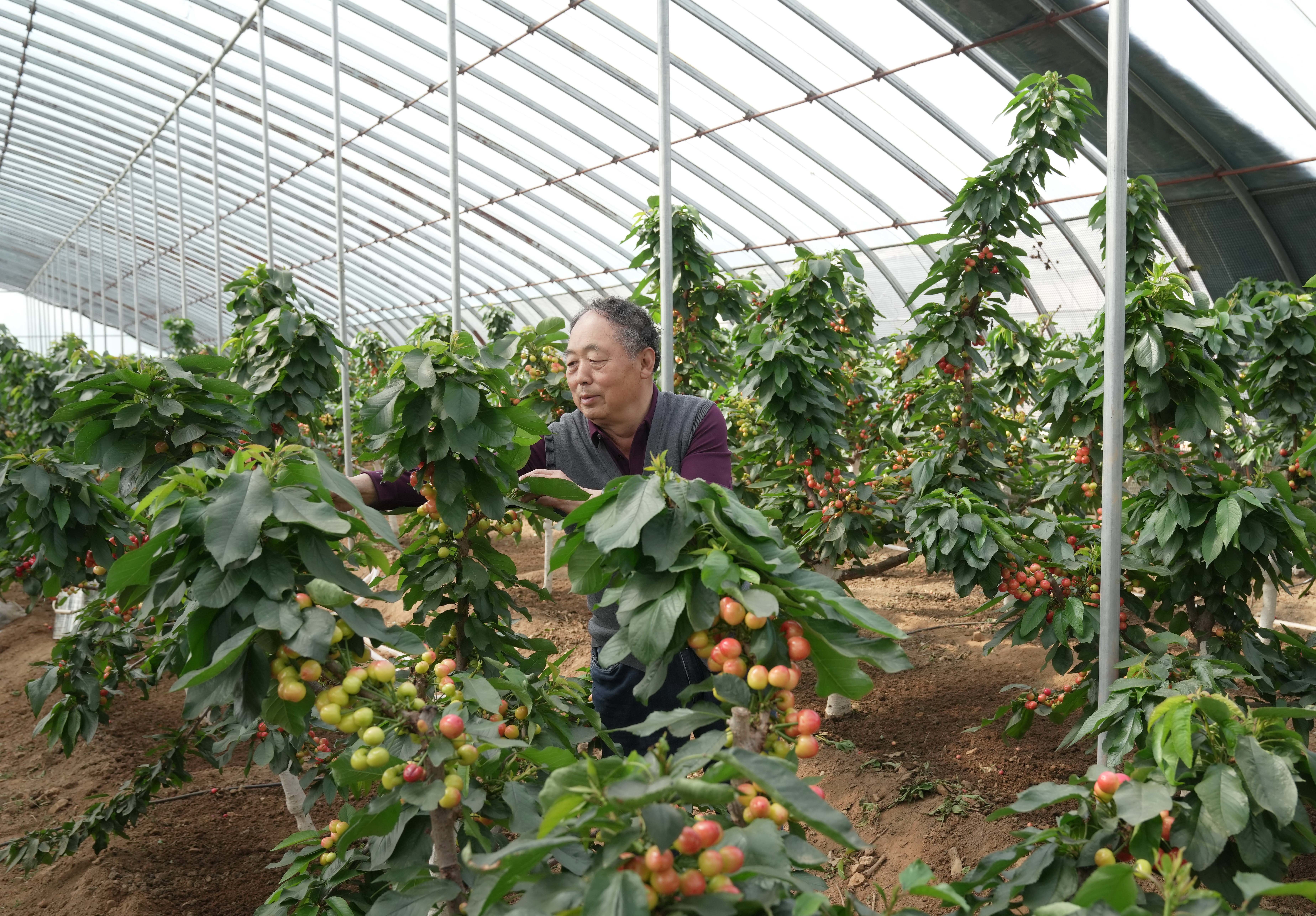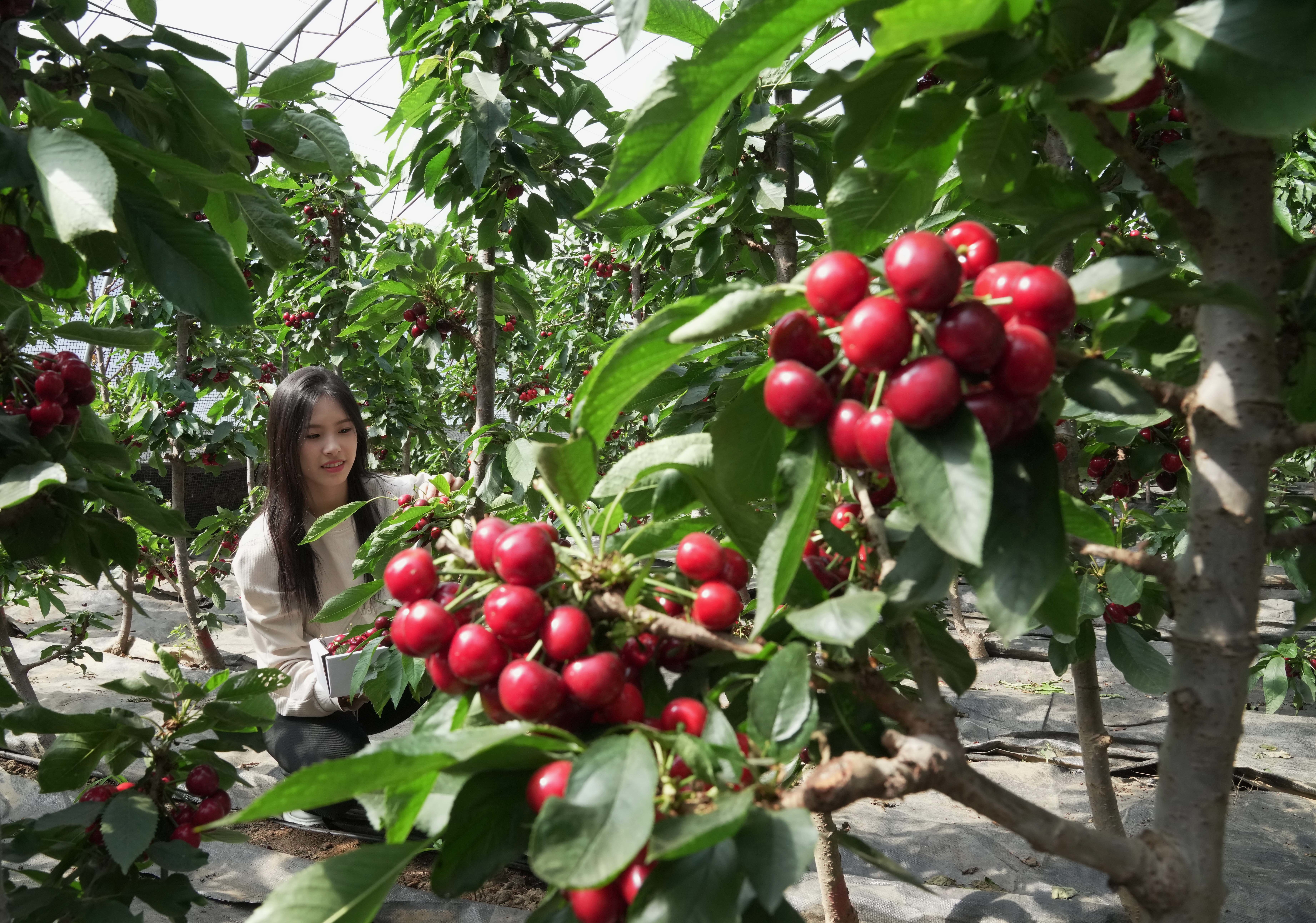 4月19日,社员在秦皇岛市山海关区石河镇一处樱桃种植合作社的大棚内管护樱桃。新华社记者 杨世尧 摄