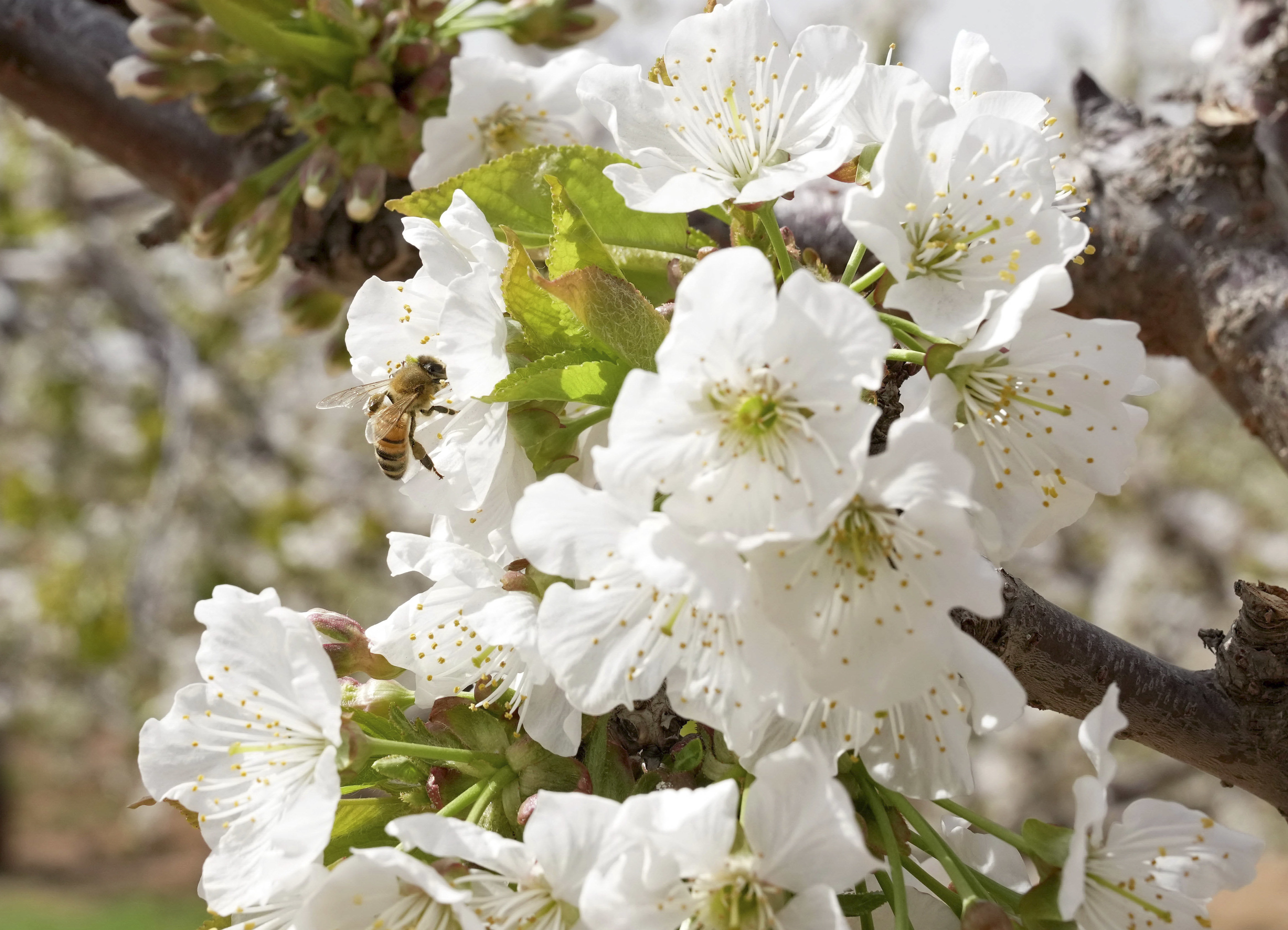 4月19日,在秦皇岛市山海关区石河镇一处樱桃园,蜜蜂落在鲜花上采蜜。新华社记者 杨世尧 摄
