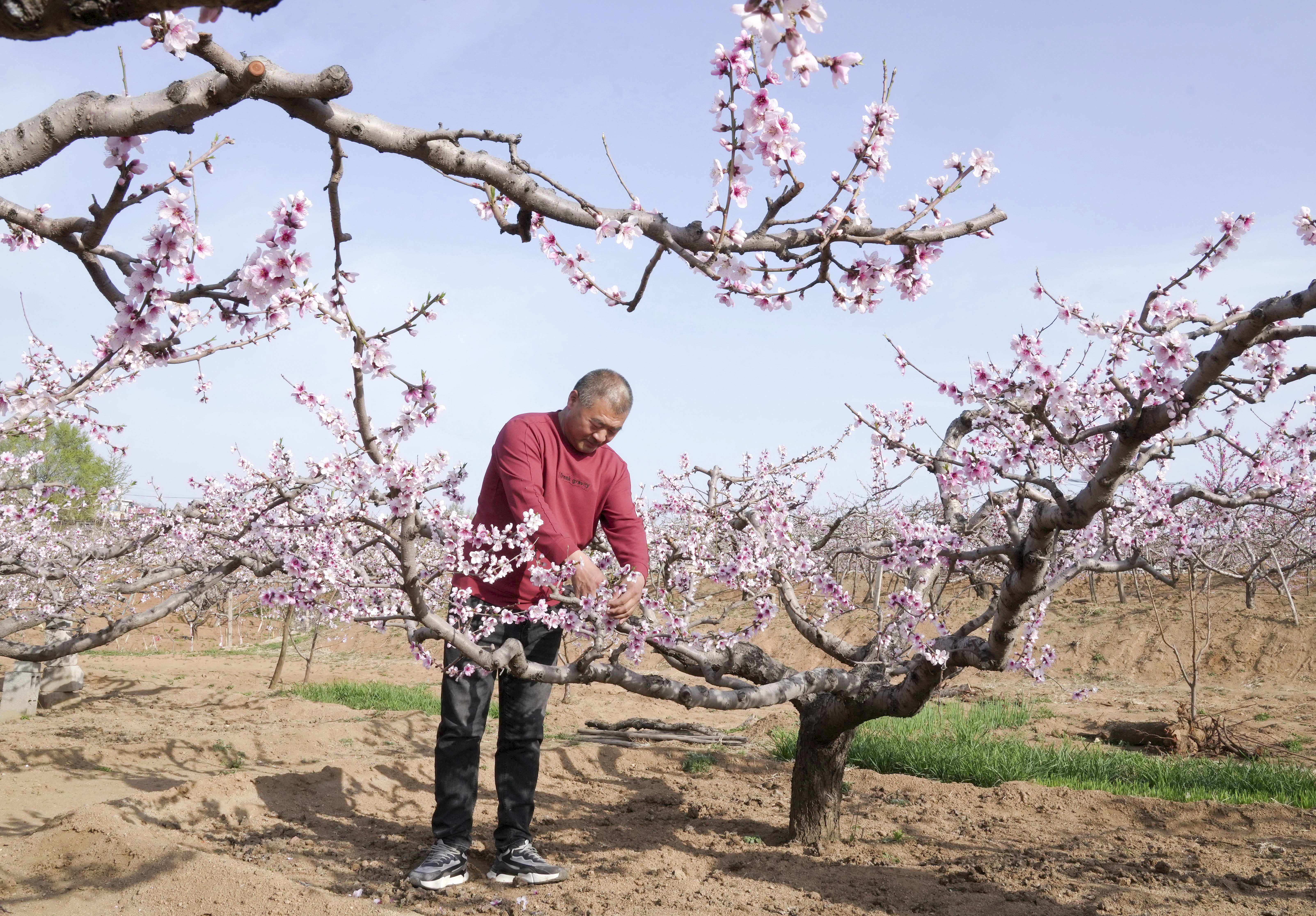 4月19日,农民在秦皇岛市山海关区孟姜镇一处桃园内疏花。新华社记者 杨世尧 摄
