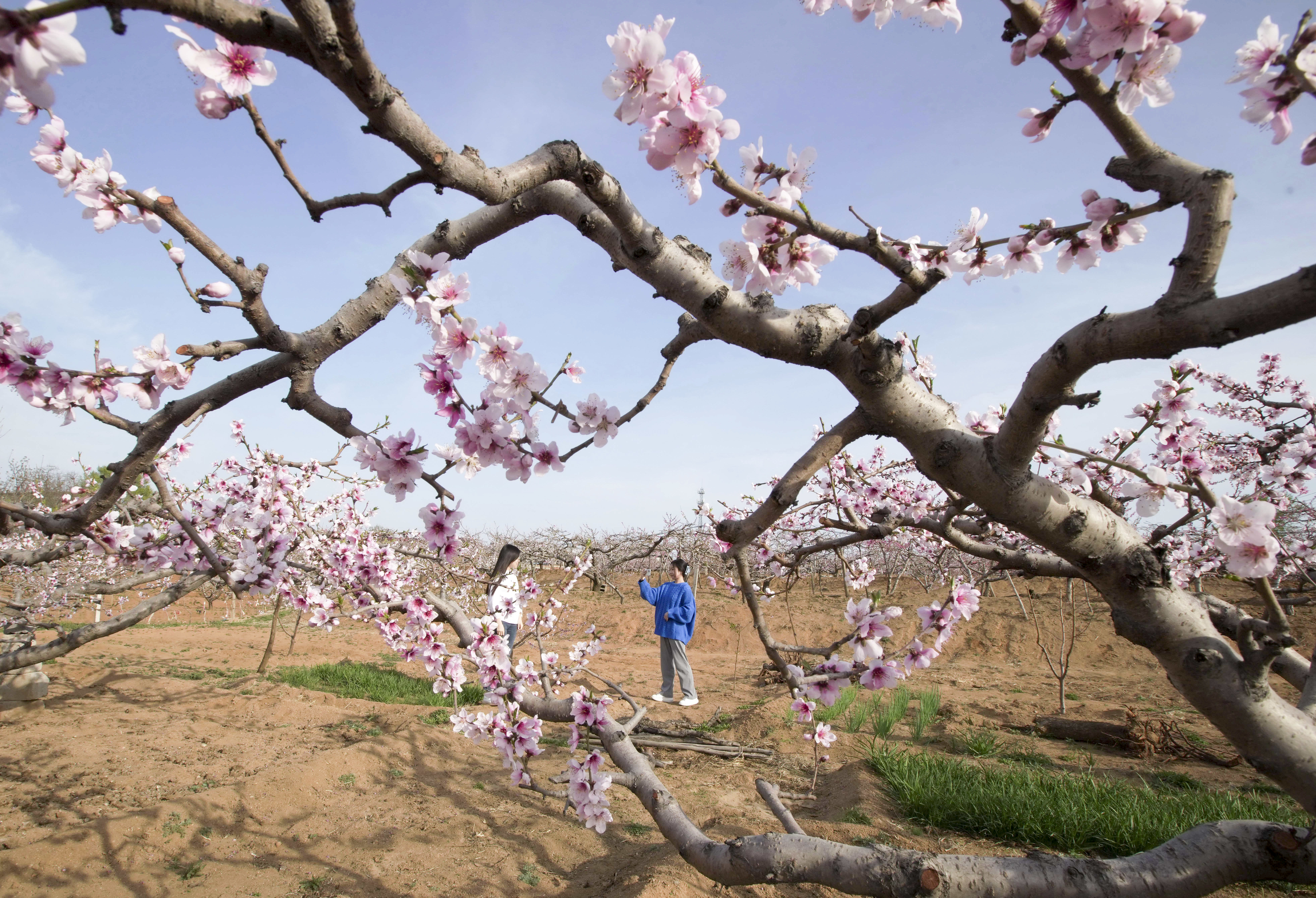 4月19日,游客在秦皇岛市山海关区孟姜镇一处桃园内拍照。新华社记者 杨世尧 摄