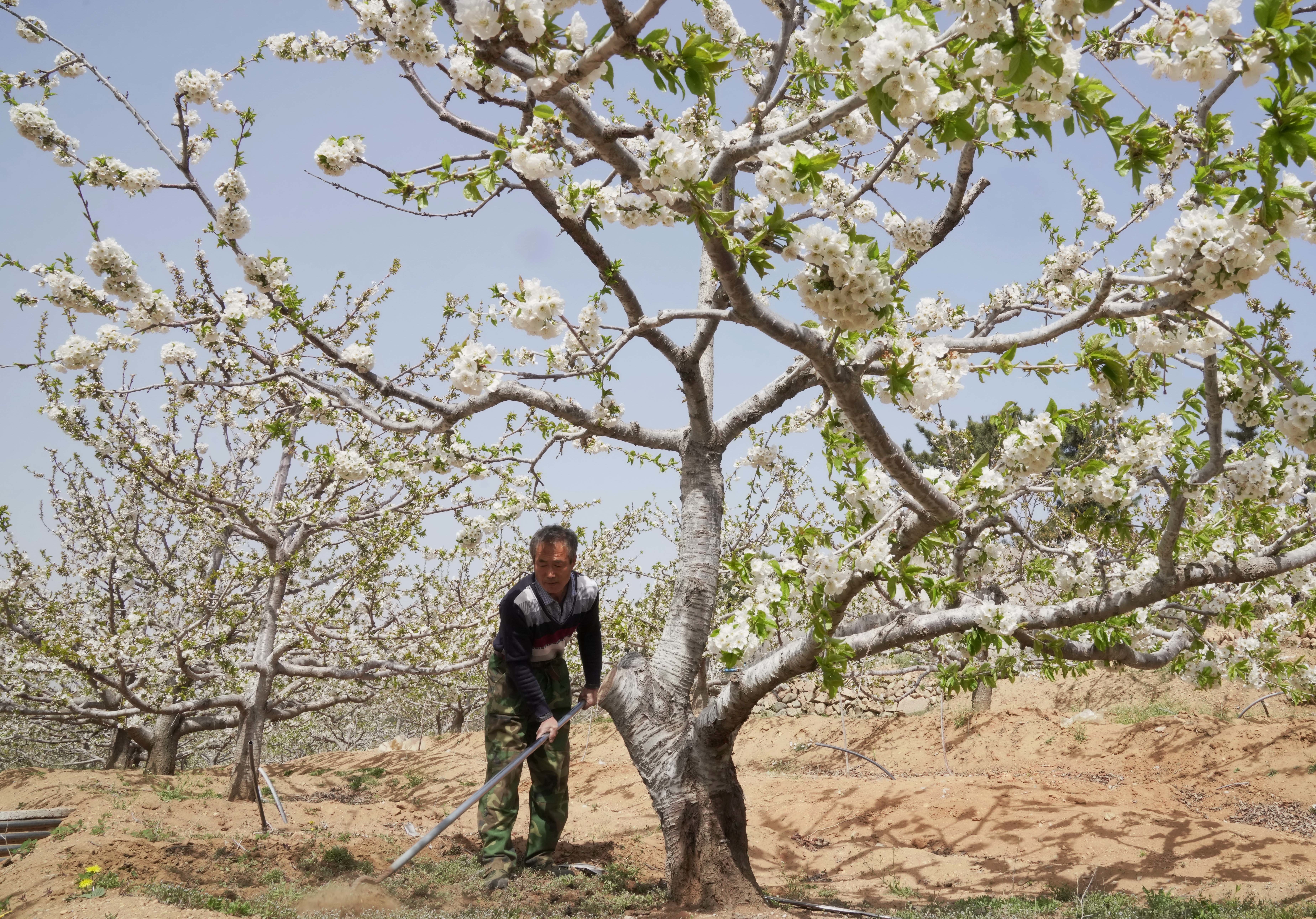 4月19日,农民在秦皇岛市山海关区石河镇的一处樱桃园内除草。新华社记者 杨世尧 摄