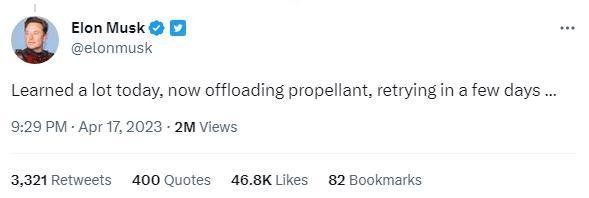 SpaceX公司首席执行官马斯克随后在推特上发文称,“学到了很多,现在卸载推进剂,过几天再尝试……”