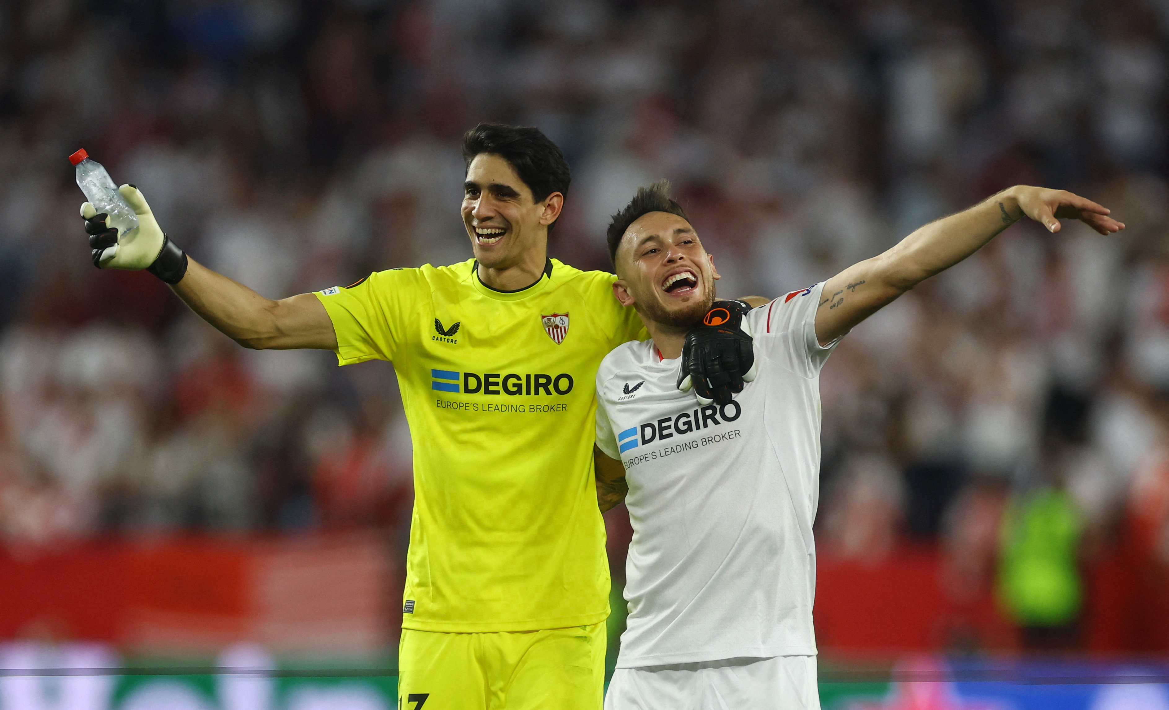 4月20日,塞维利亚队门将布努(左)和球员奥坎波斯在赛后庆祝晋级。新华社/路透