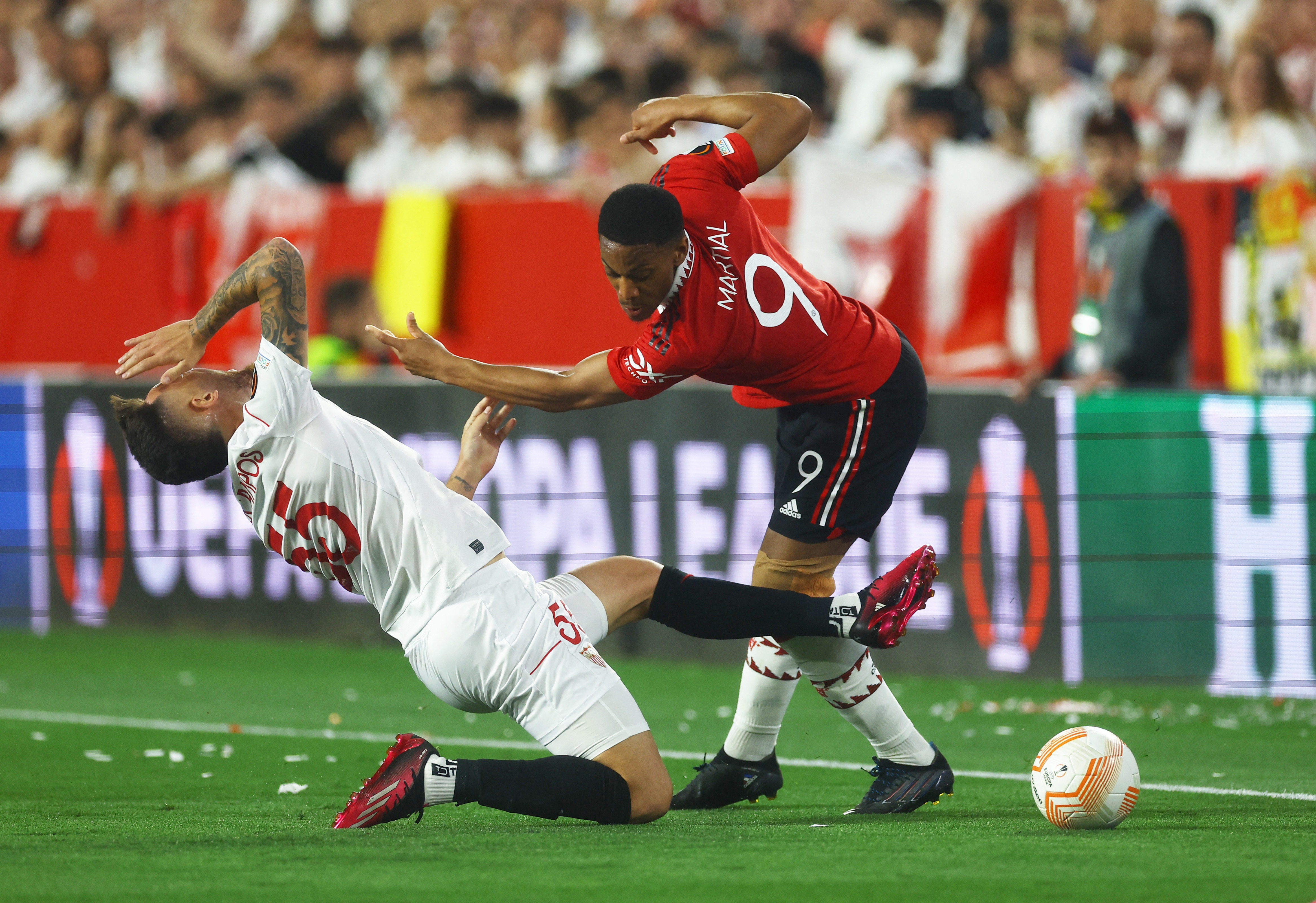 4月20日,塞维利亚队球员奥坎波斯(左)与曼联队球员马夏尔在比赛中拼抢。新华社/路透
