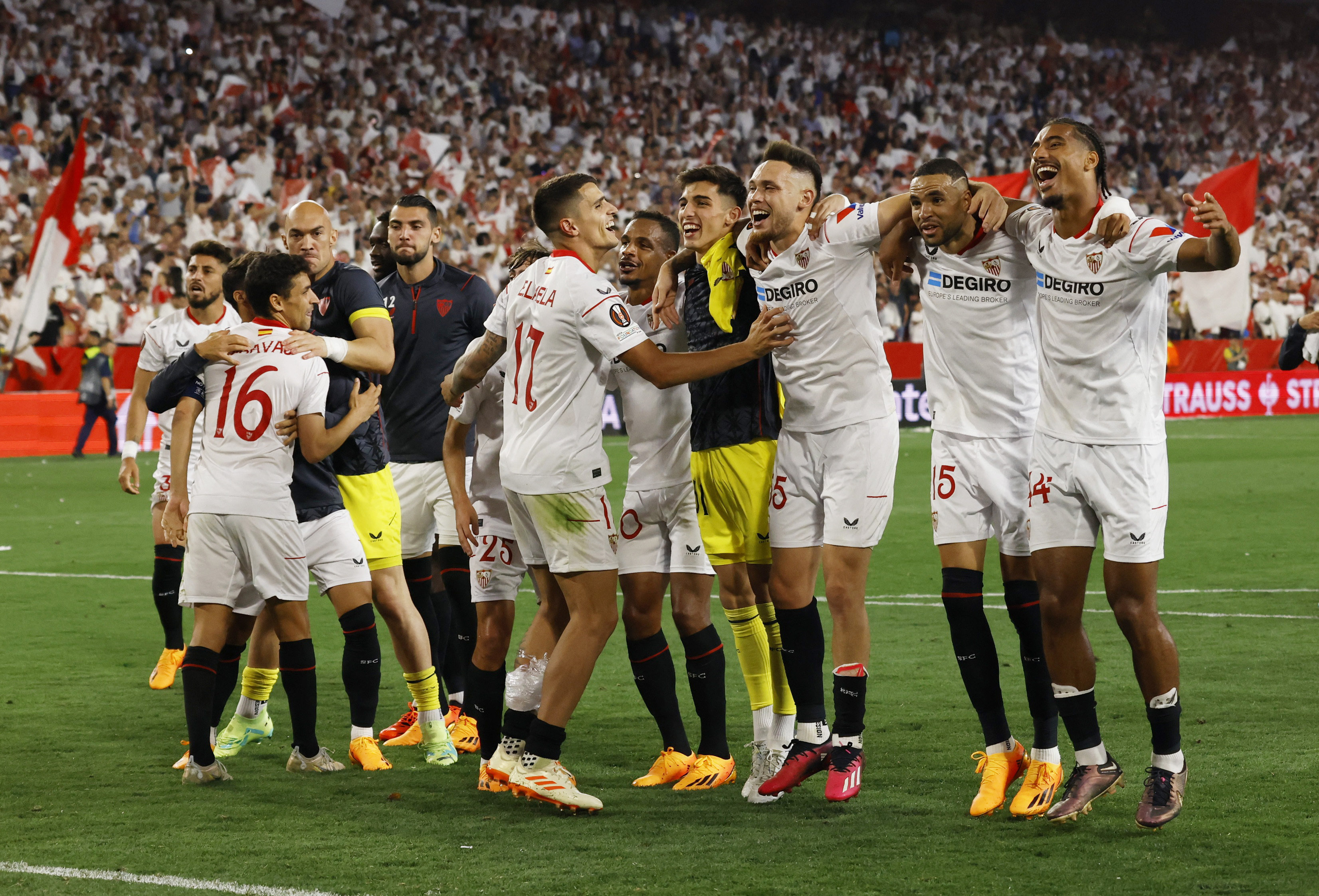 4月20日,塞维利亚队球员在赛后庆祝晋级。新华社/路透