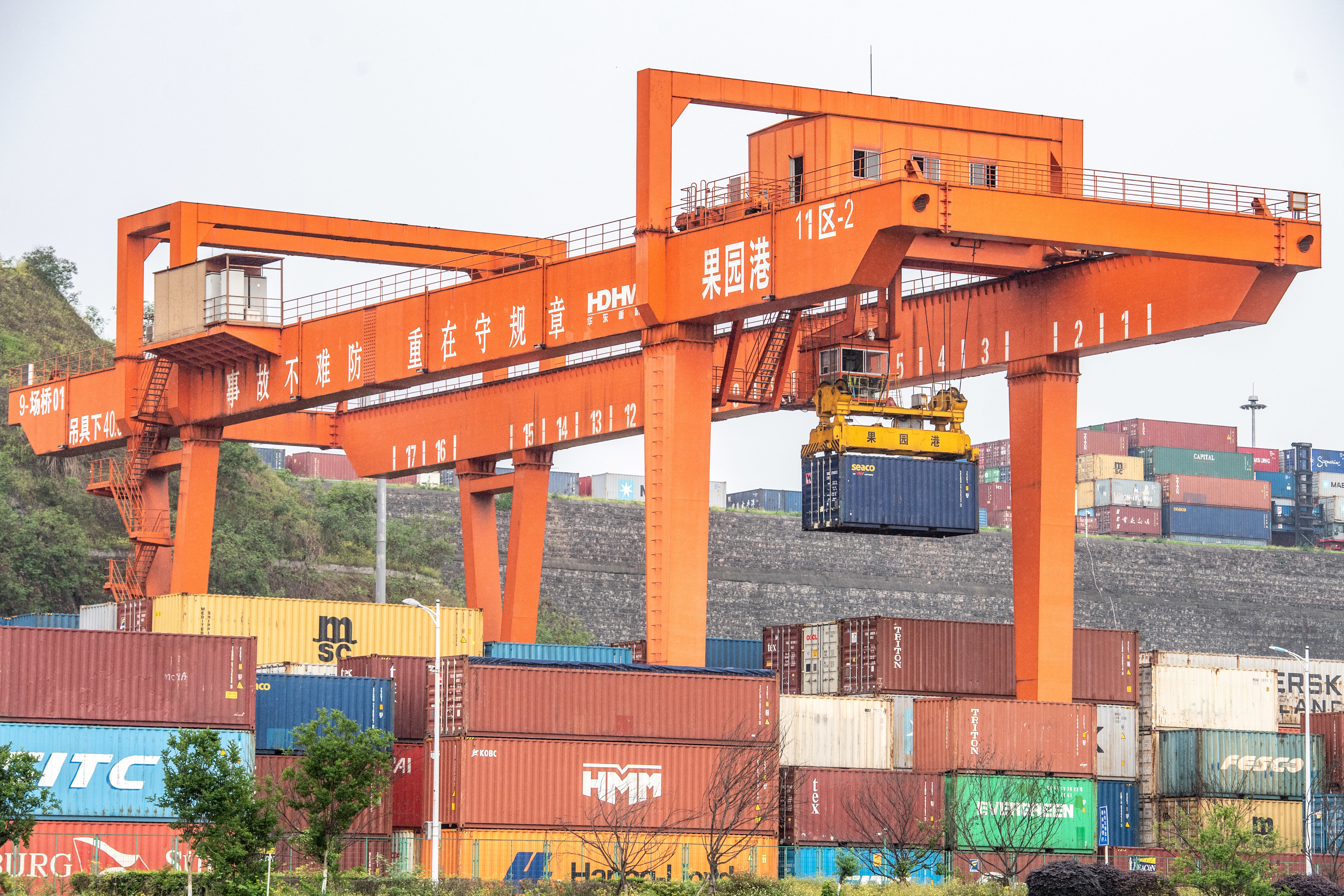 4月20日,在重庆果园港,机械设备在吊装集装箱。新华社记者 唐奕 摄