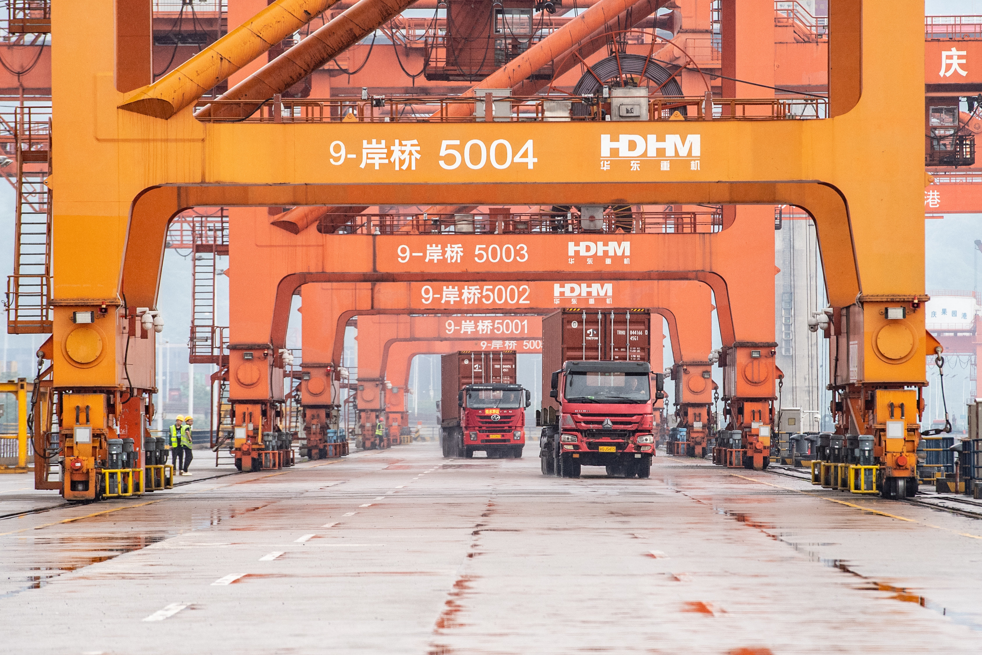 4月20日,在重庆果园港,货车在运送集装箱。新华社记者 唐奕 摄