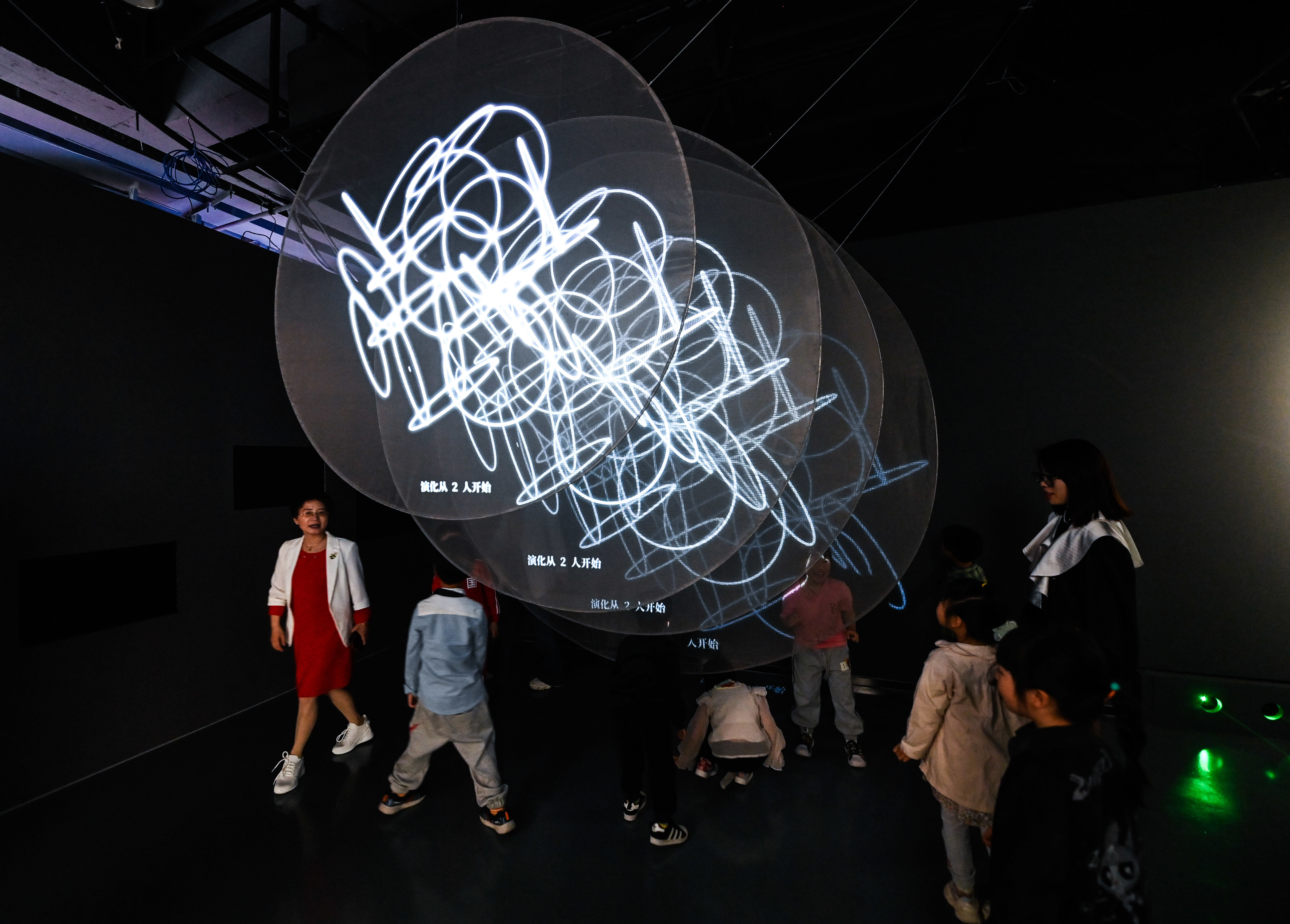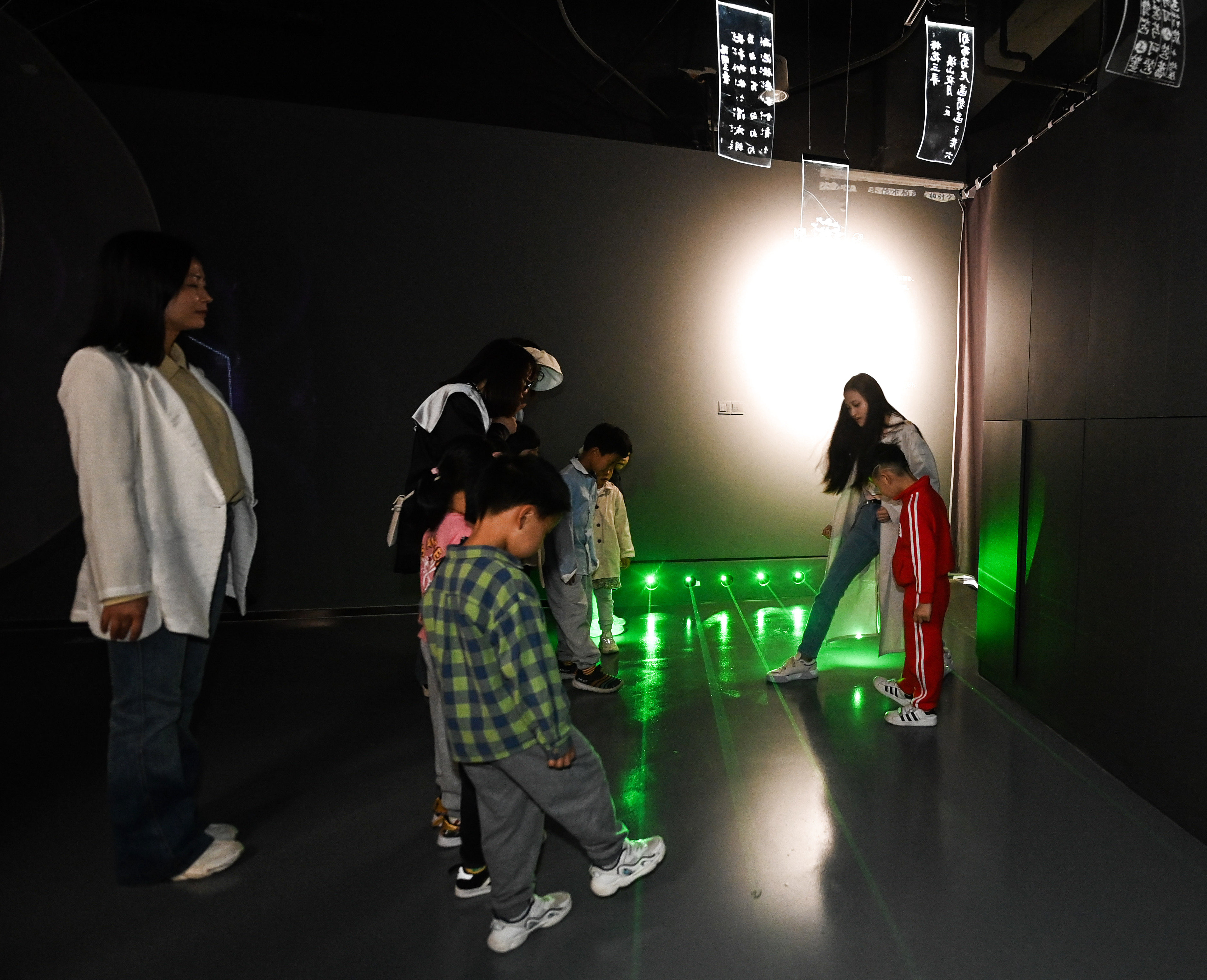 4月21日,小朋友们在老师的带领下在嘉兴市图书馆元宇宙阅读体验馆内通过触碰不同光线来感受音律的变化。新华社记者 徐昱 摄