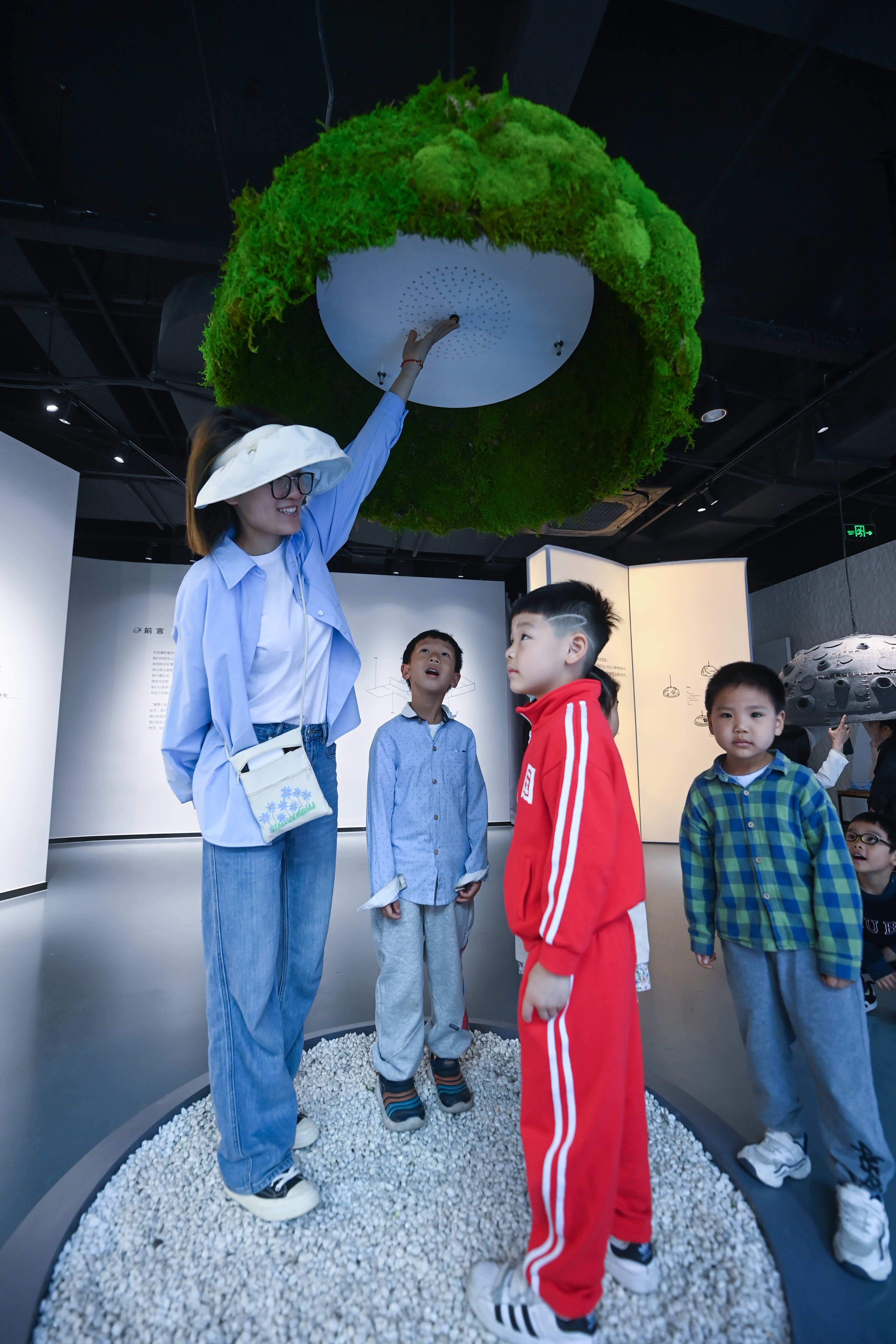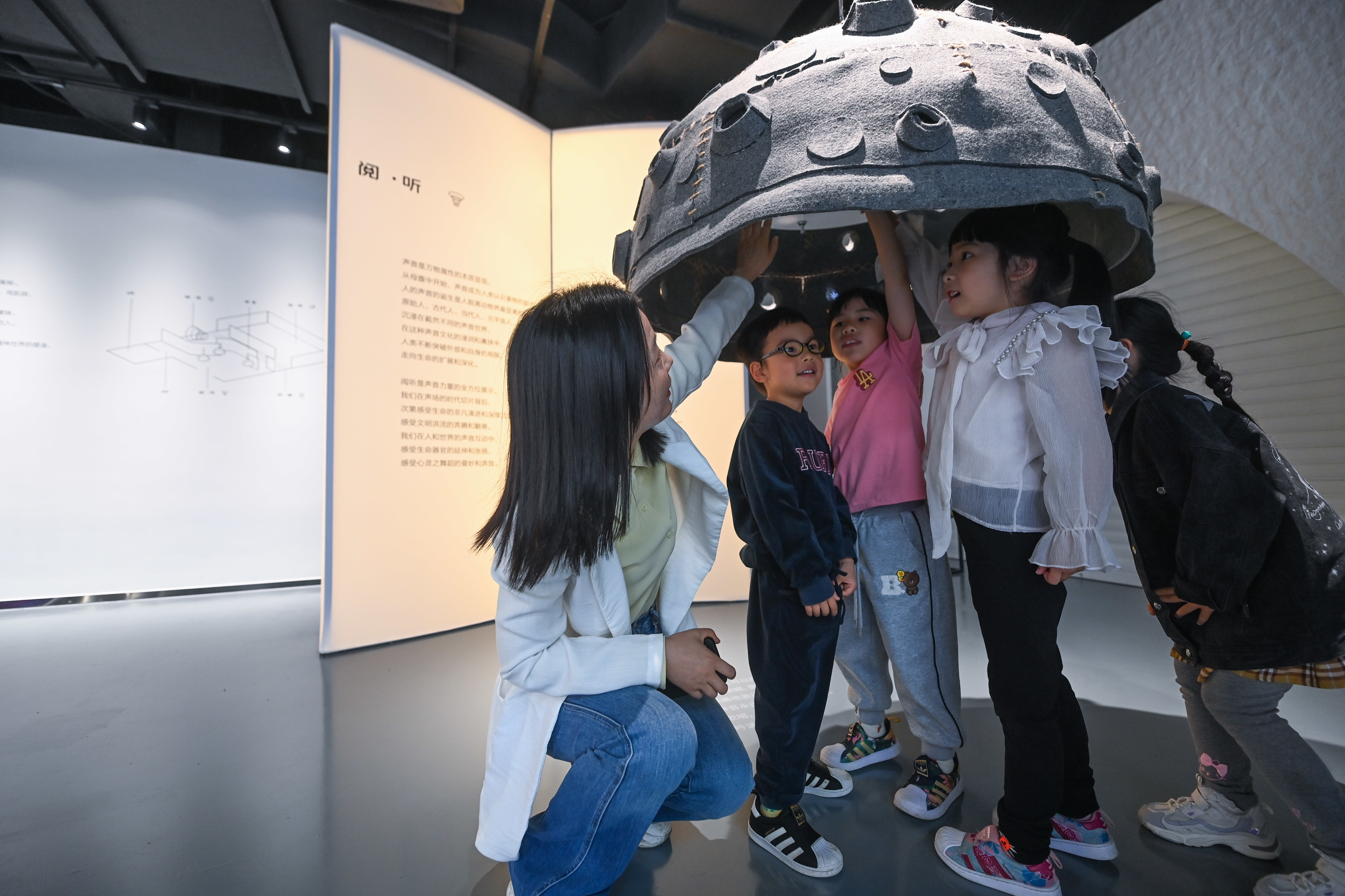 4月21日,小朋友们在老师的带领下在嘉兴市图书馆元宇宙阅读体验馆的阅听体验区聆听自然界的各种声音。新华社记者 徐昱 摄