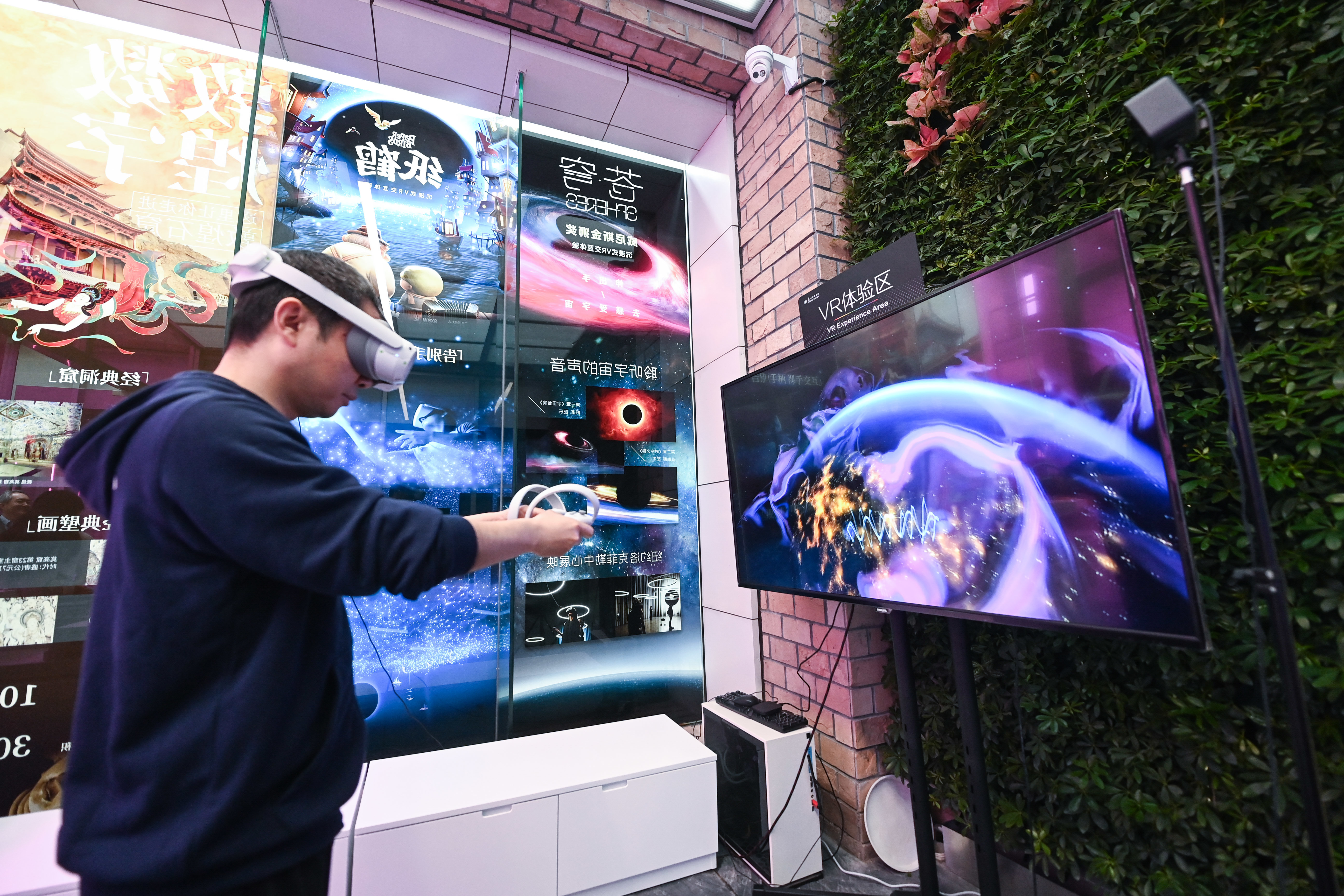 4月21日,读者在嘉兴市图书馆元宇宙阅读体验馆的艺术课堂通过环幕体感投影学习古代书画知识。新华社记者 徐昱 摄