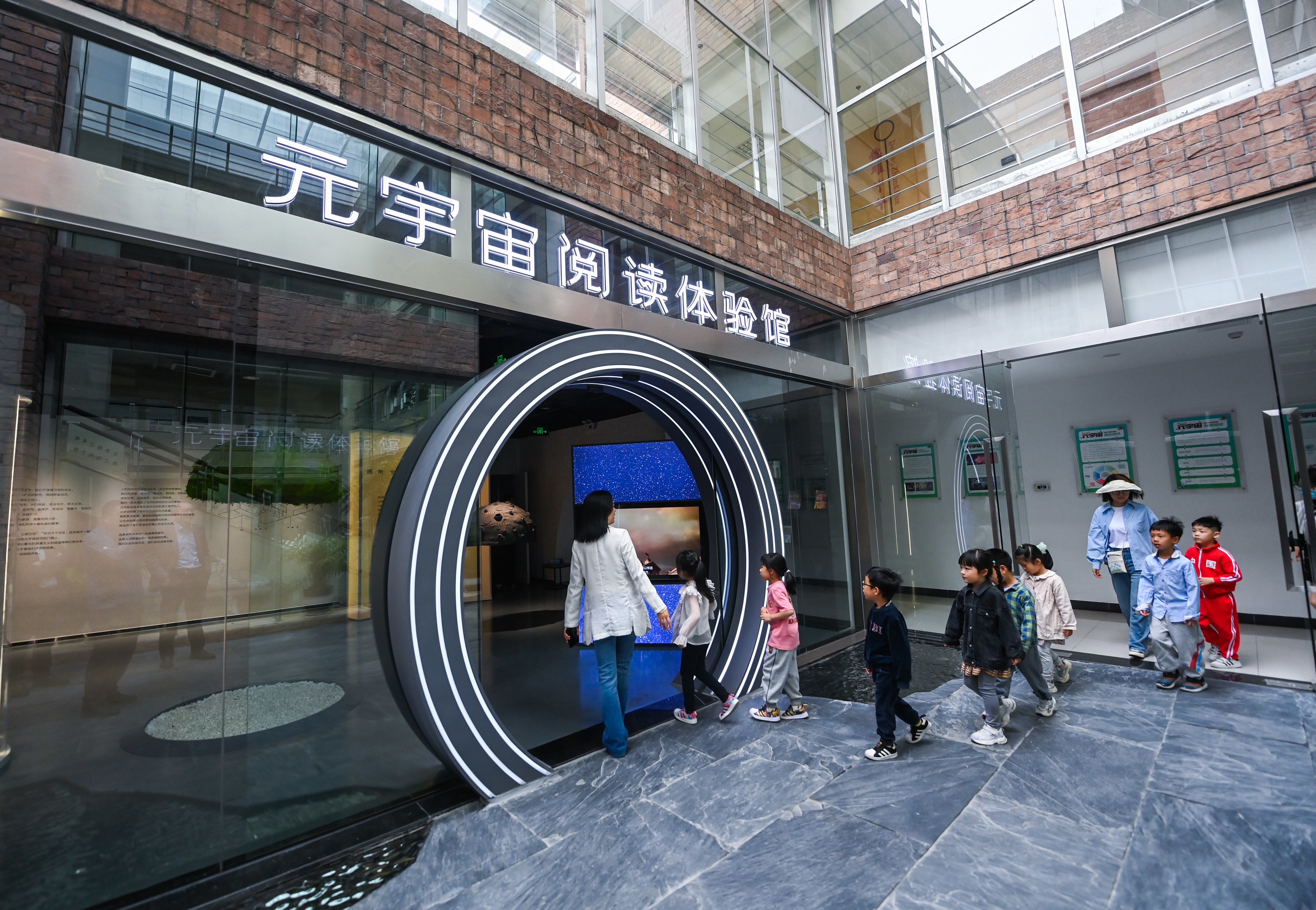 4月21日,小朋友们在老师的带领下进入嘉兴市图书馆元宇宙阅读体验馆参观体验。新华社记者 徐昱 摄
