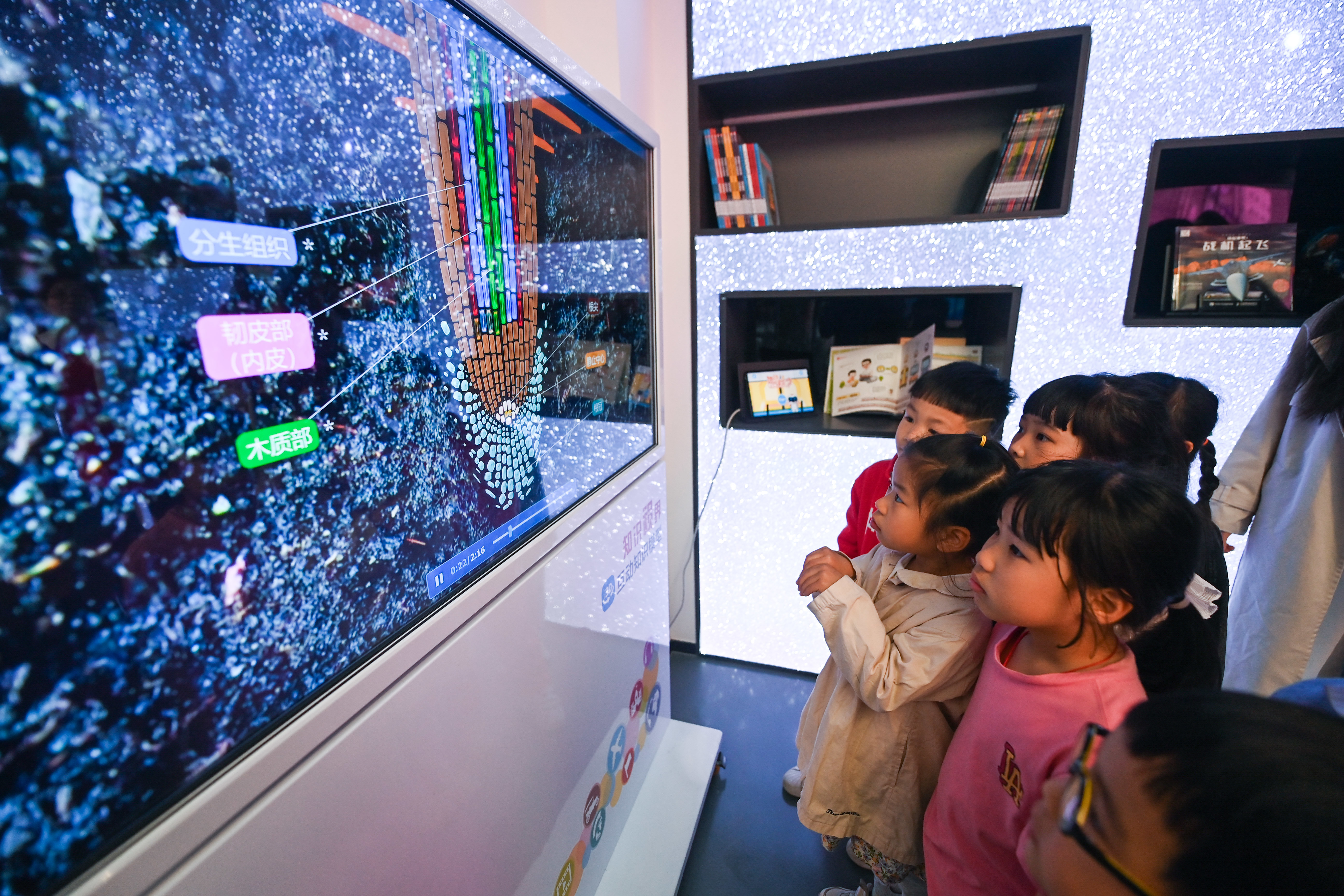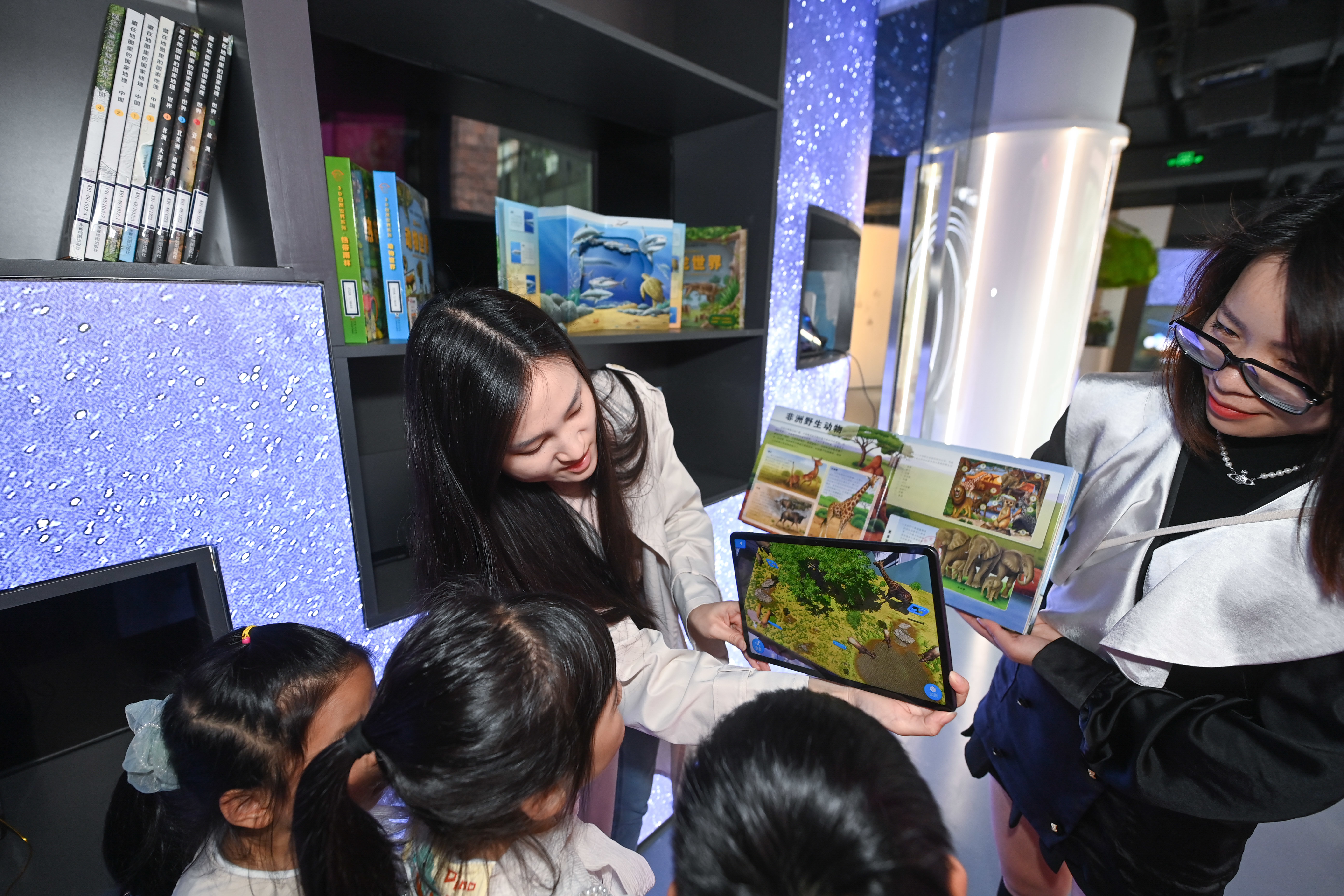 4月21日,在嘉兴市图书馆元宇宙阅读体验馆,小朋友们在老师的帮助下学习动植物知识。新华社记者 徐昱 摄