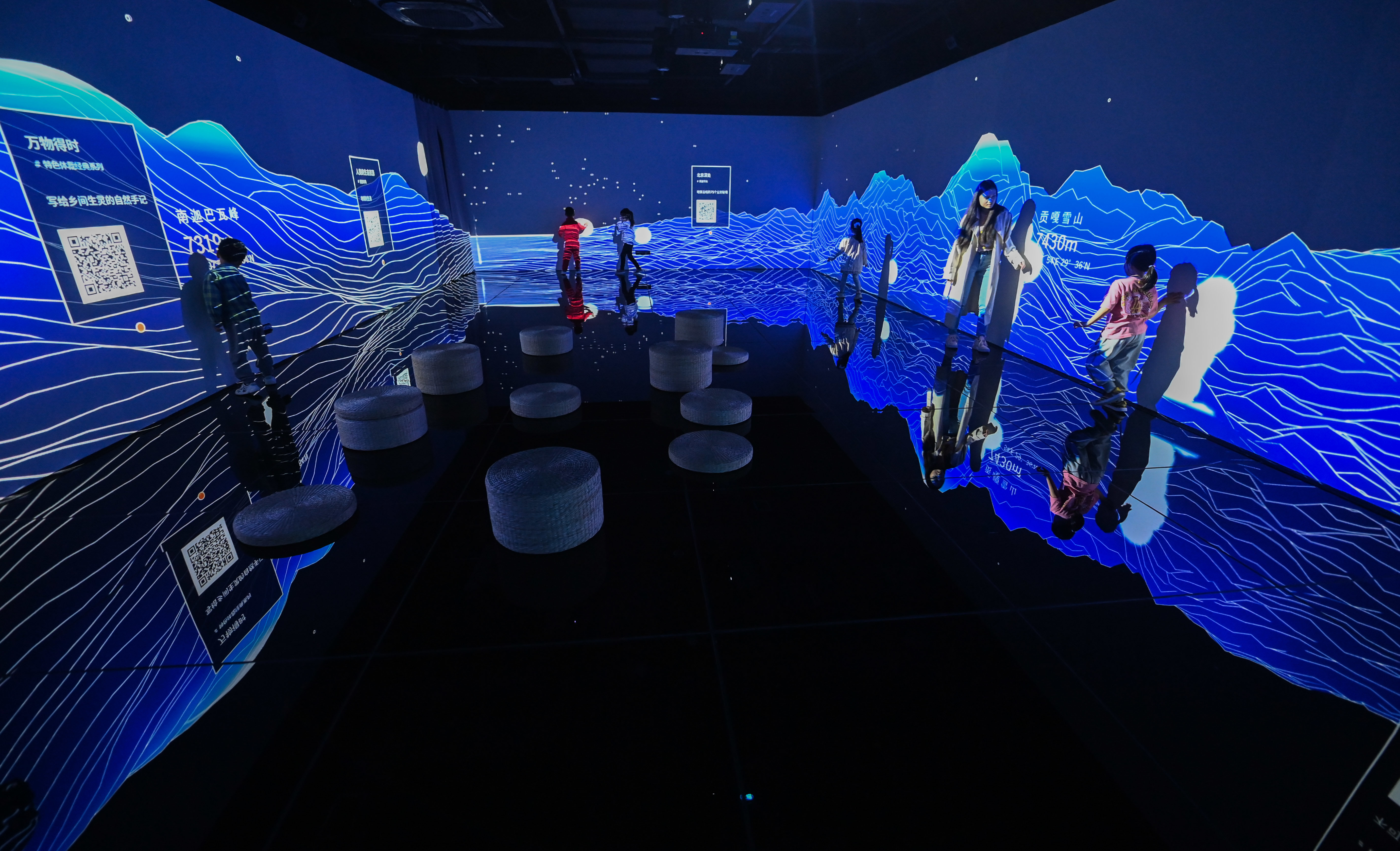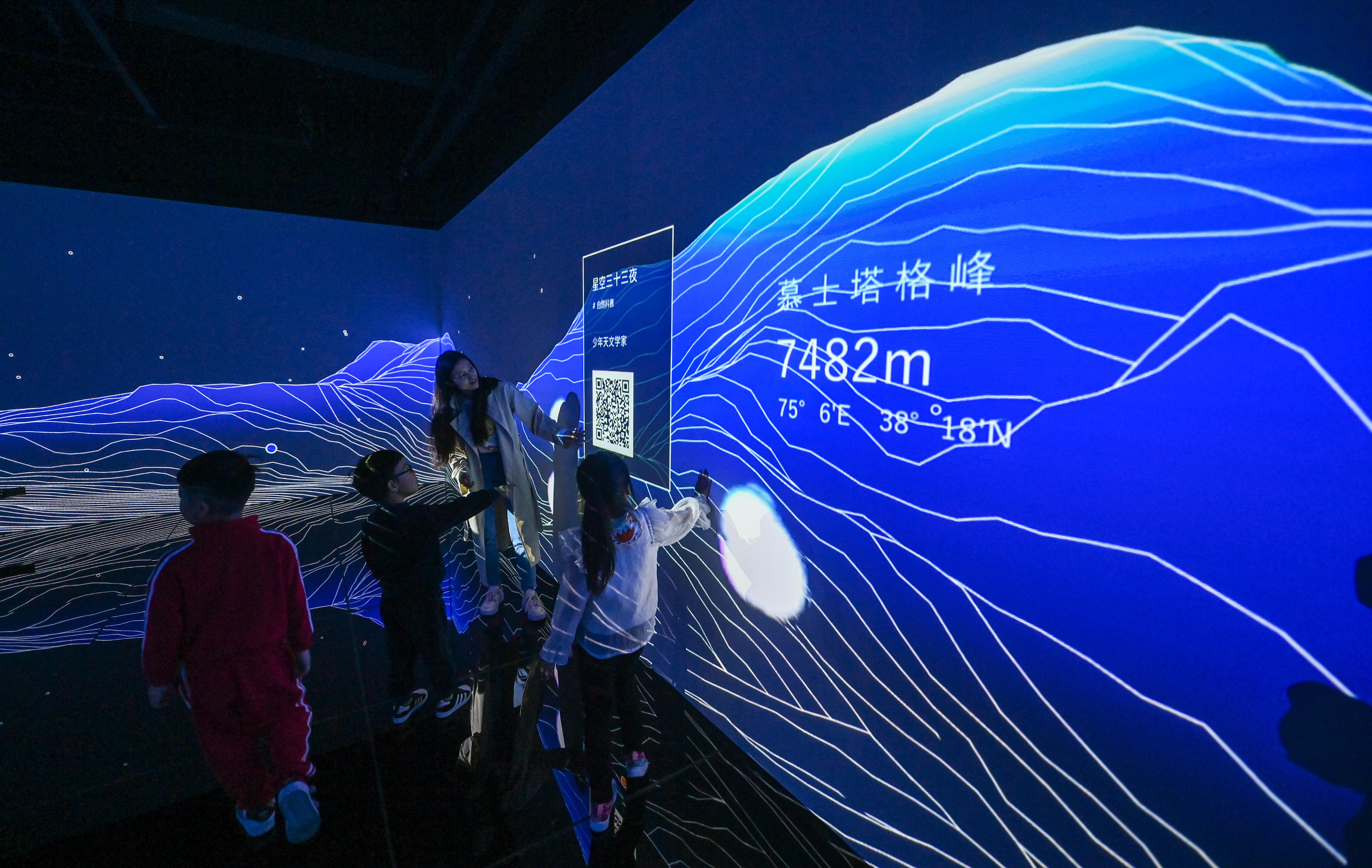4月21日,读者在嘉兴市图书馆元宇宙阅读体验馆的自然课堂通过环幕体感投影学习各大山脉山峰的知识。新华社记者 徐昱 摄