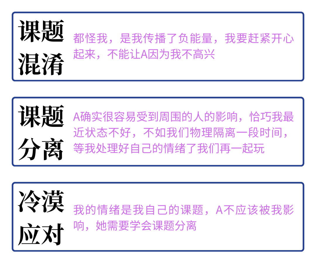 放下别人的课题:A容易受到别人的情绪影响,是ta自己的事情,我不能因为ta这个特点,就强迫自己赶紧开心起来,否则我也很难受。