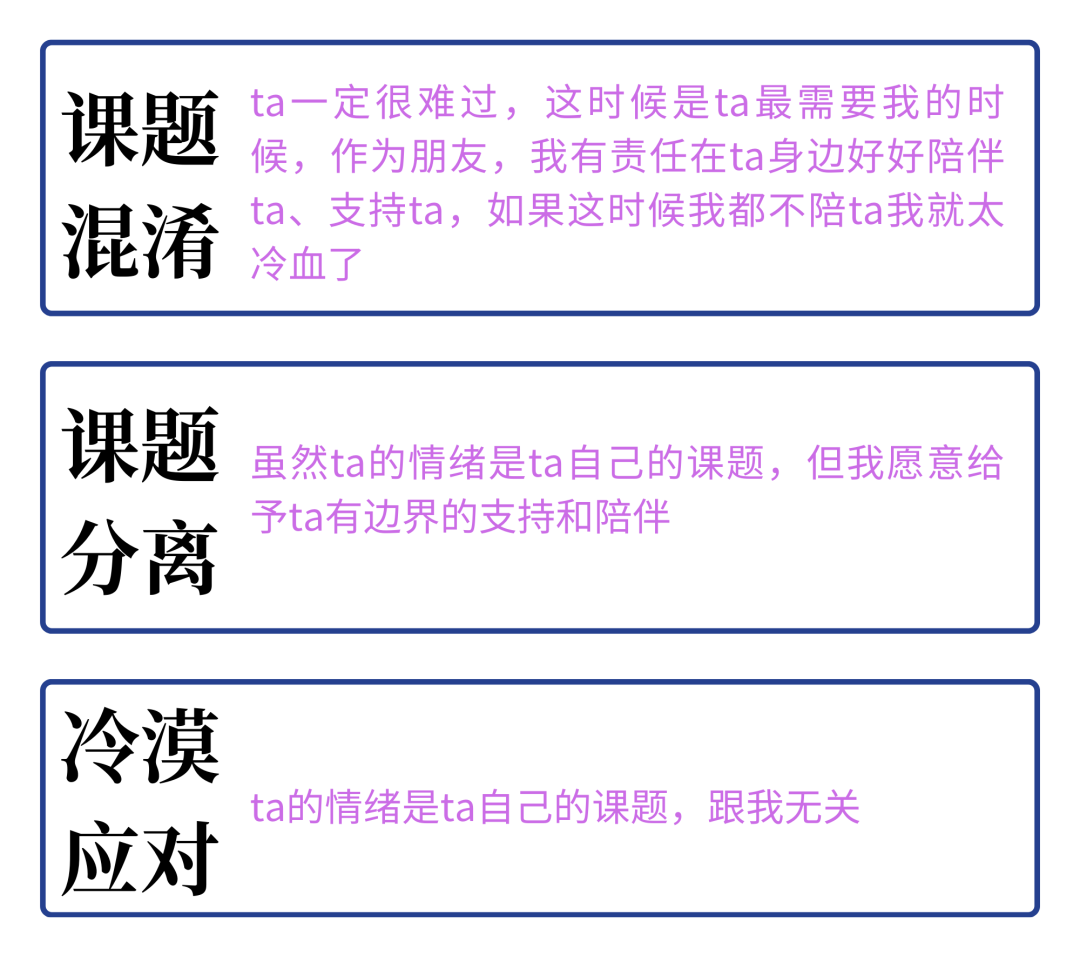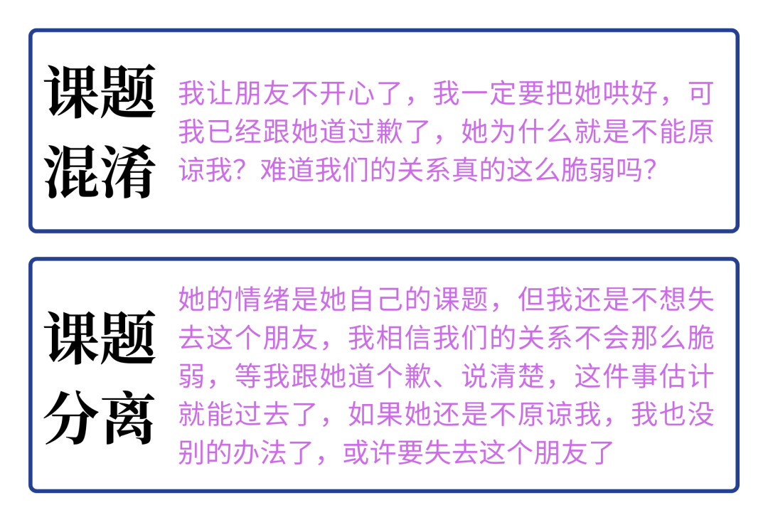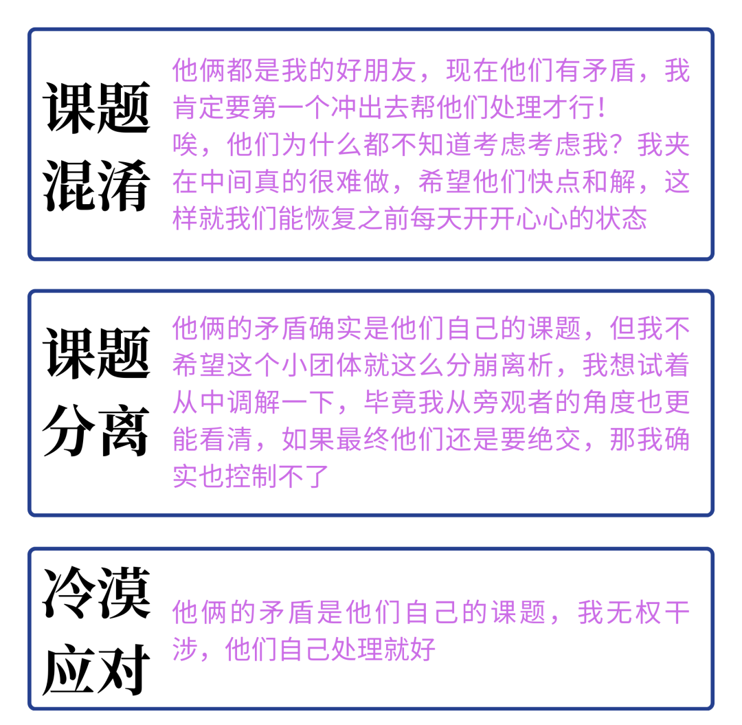 然后要冷静地划清界限,不去强行干涉别人的课题,也不让别人强行干涉自己的课题。