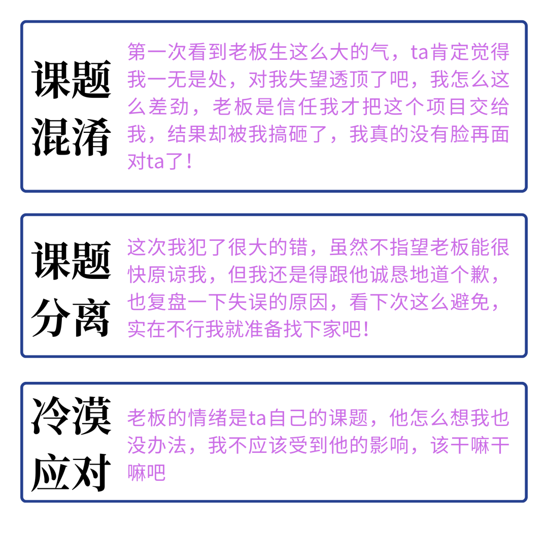 老板的课题有:「老板自己的情绪」,「老板如何处理这件事情」,「老板如何评价我,以后还会不会把项目交给我」