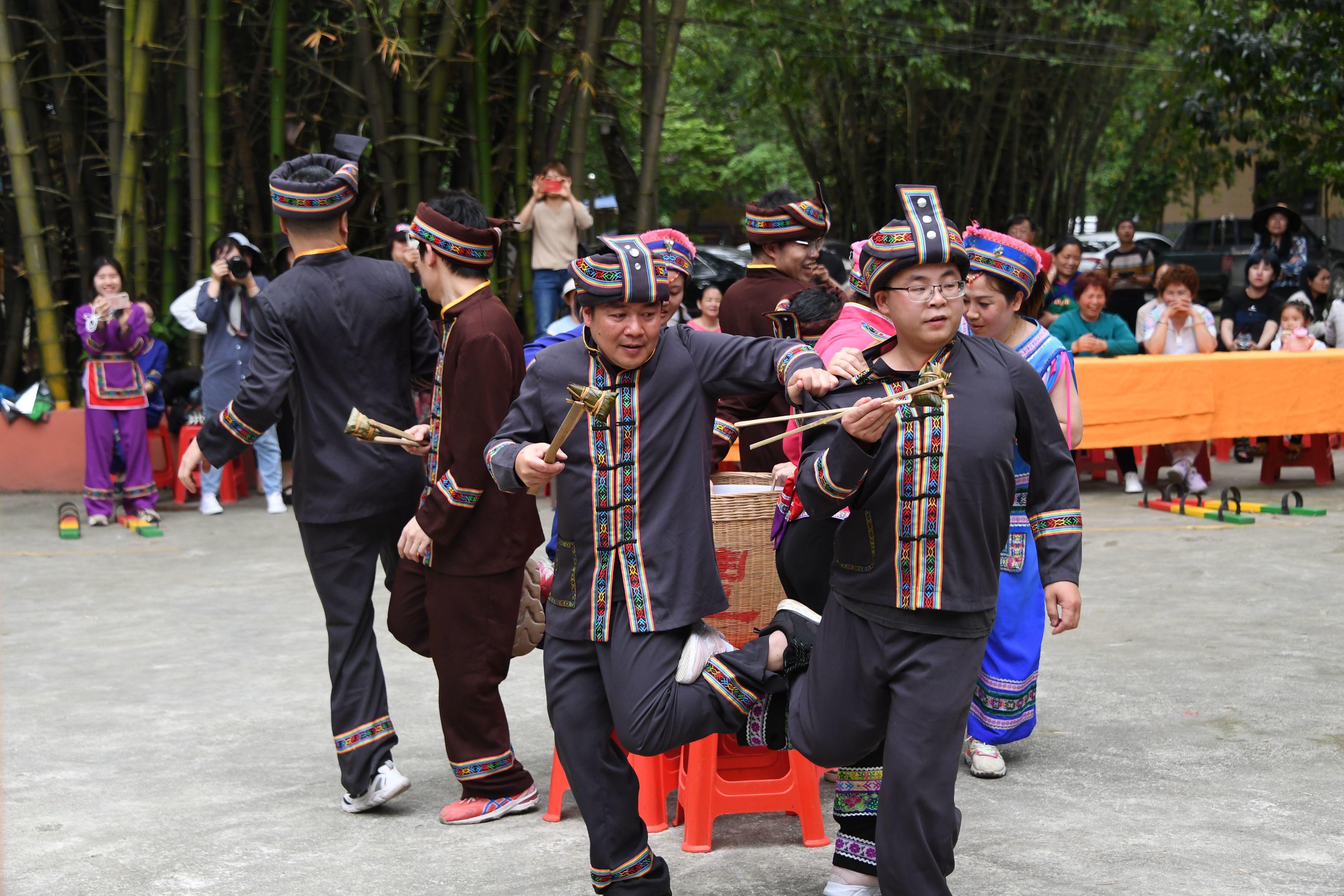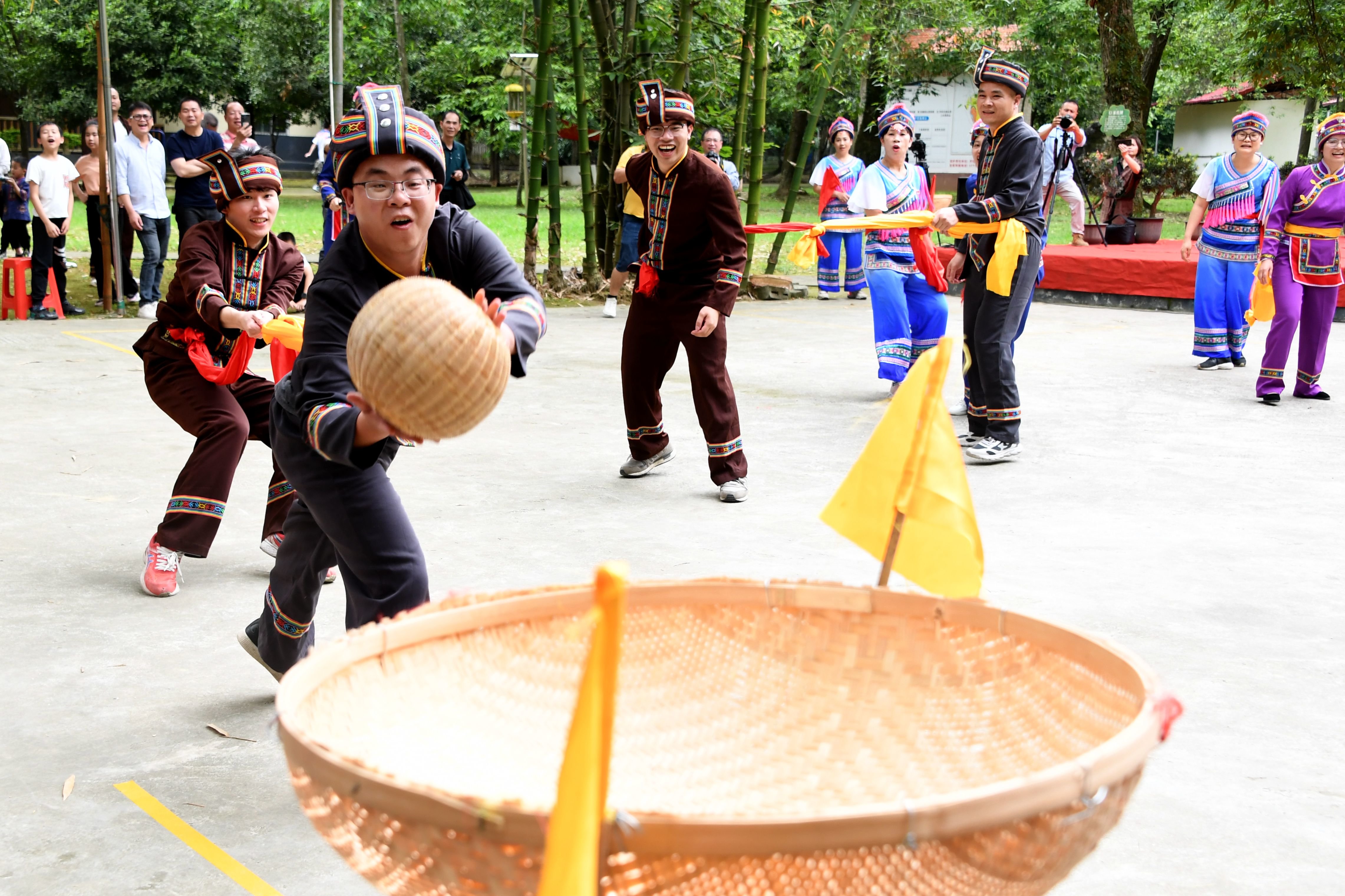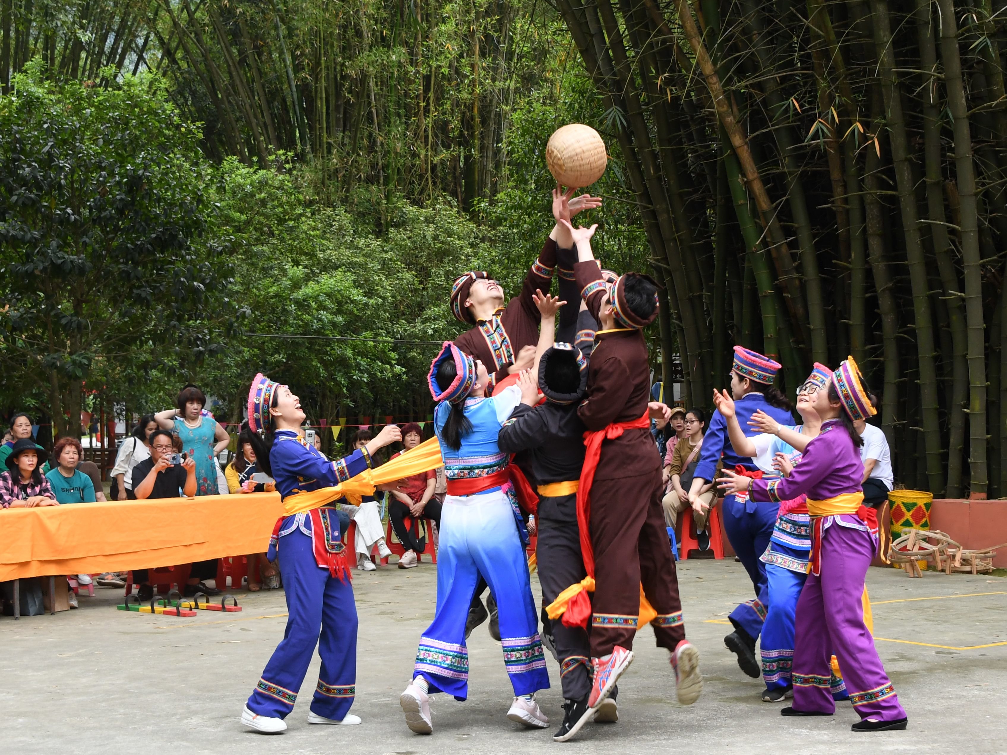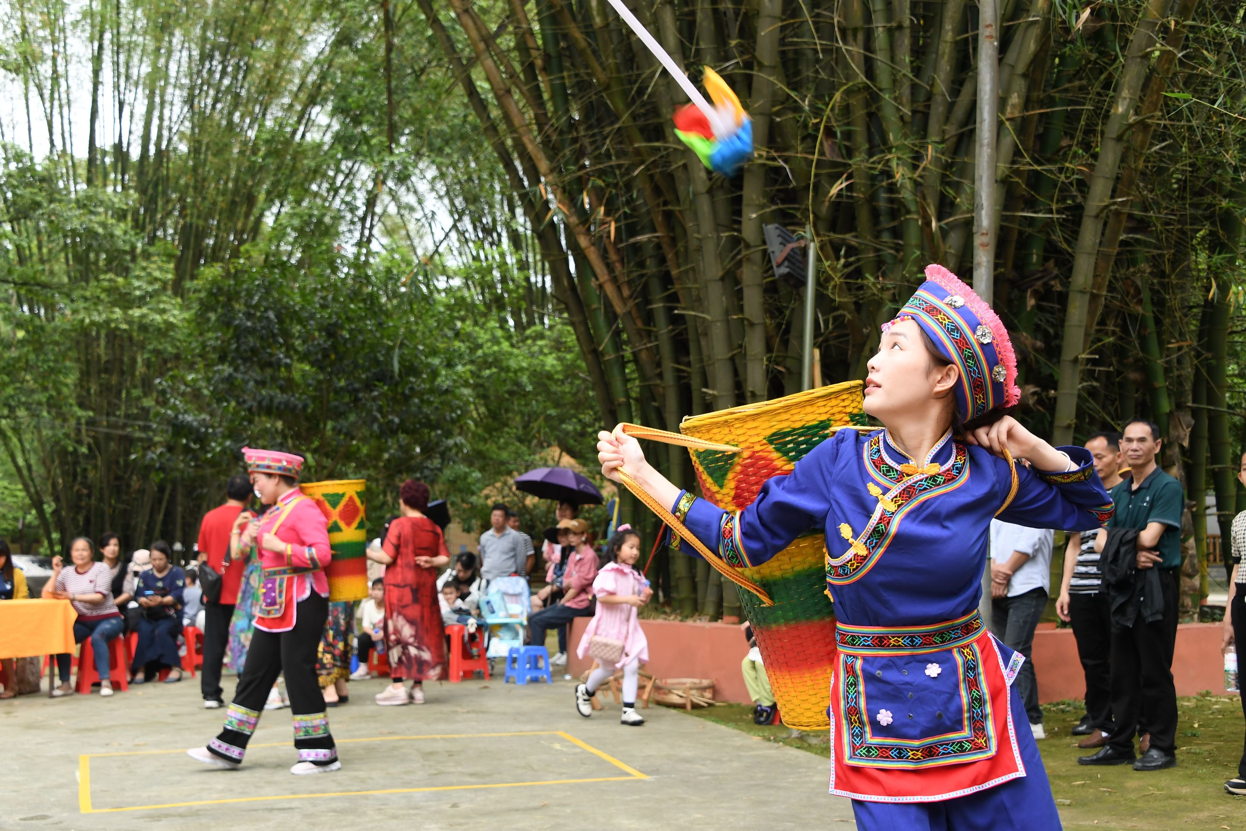 4月21日,在罗城县米椎林景区,人们参加仫佬竹球比赛。新华社发(韦如代 摄)
