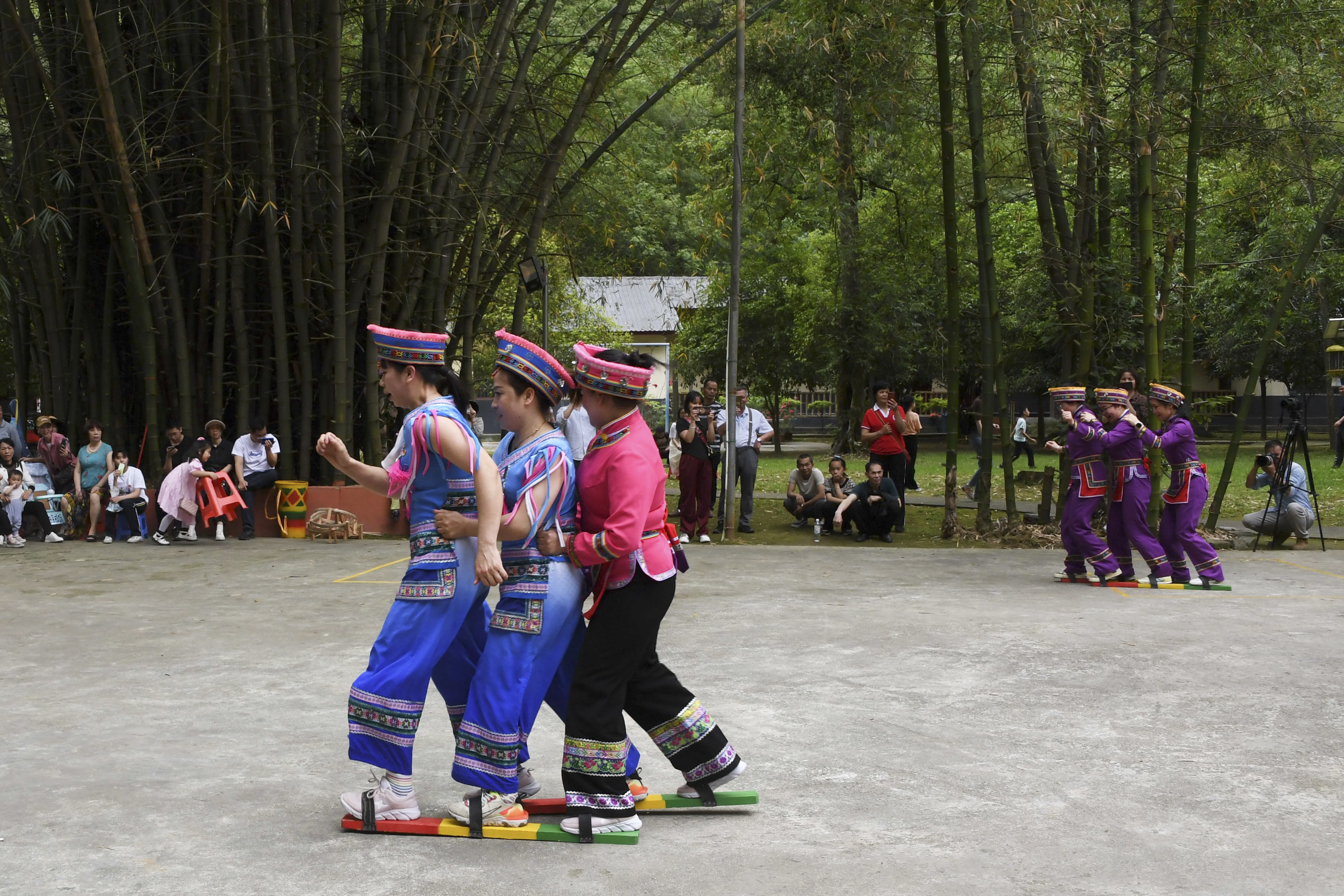 4月21日,在罗城县米椎林景区,人们参加板鞋竞技比赛。新华社发(韦如代 摄)