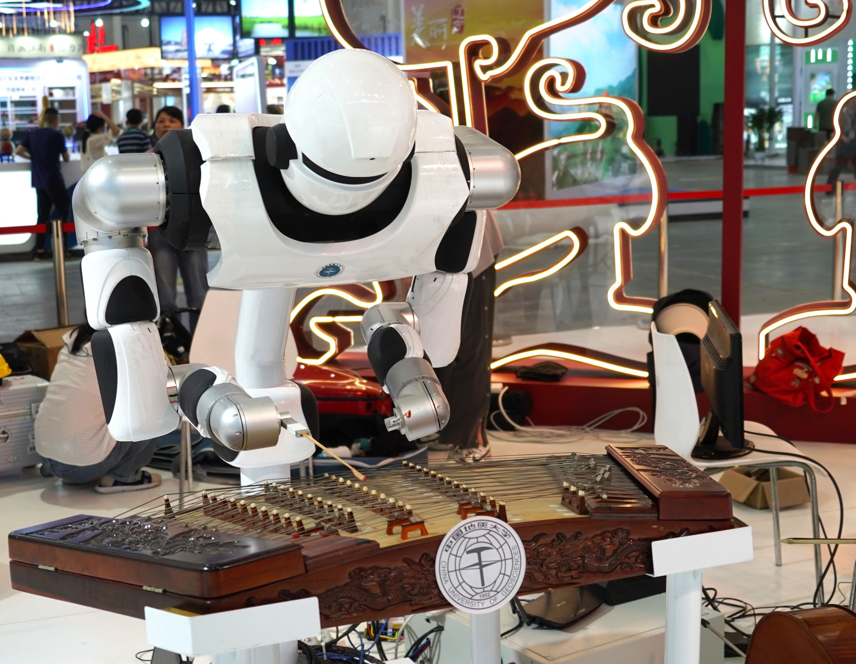 湖北馆内,机器人在用扬琴演奏传统乐曲。新华社记者龚联康 摄