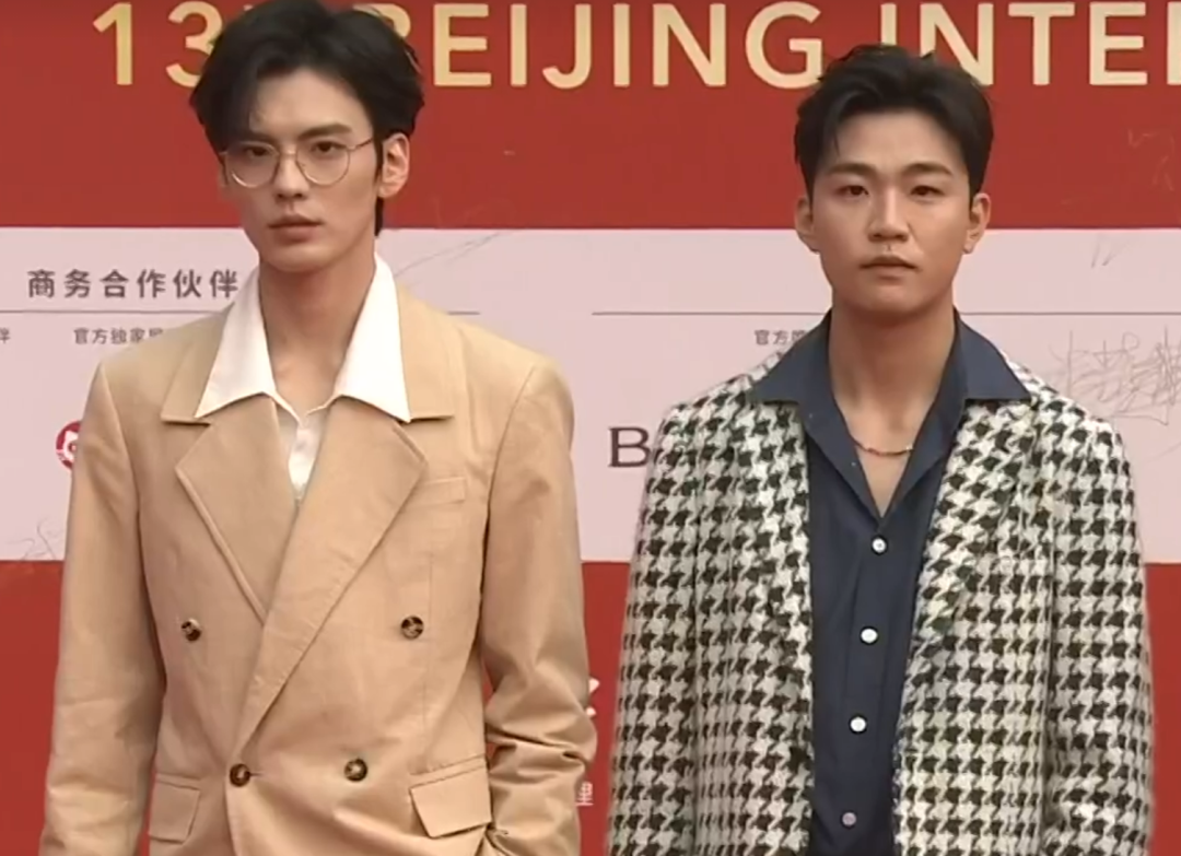 爱豆毕雯珺(左)在红毯上的造型有潮男的感觉,证明他打扮后是帅气的,但他在古装剧里没有了发型的修饰,是会被评为“丑男”的水平,可见他的帅气很依赖妆发。
