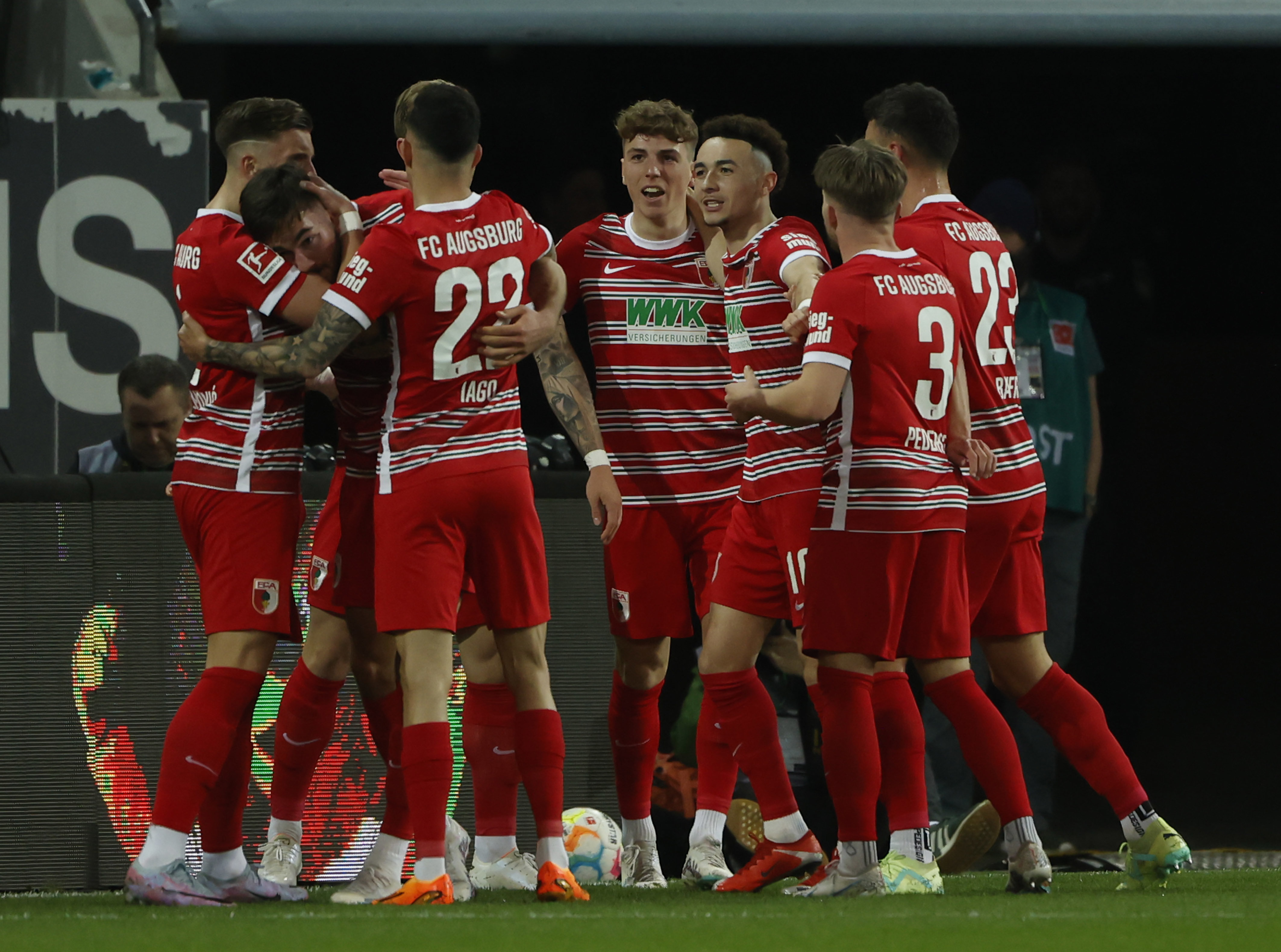 4月21日,奥格斯堡队球员在比赛中庆祝进球。新华社发(菲利普·鲁伊兹摄)