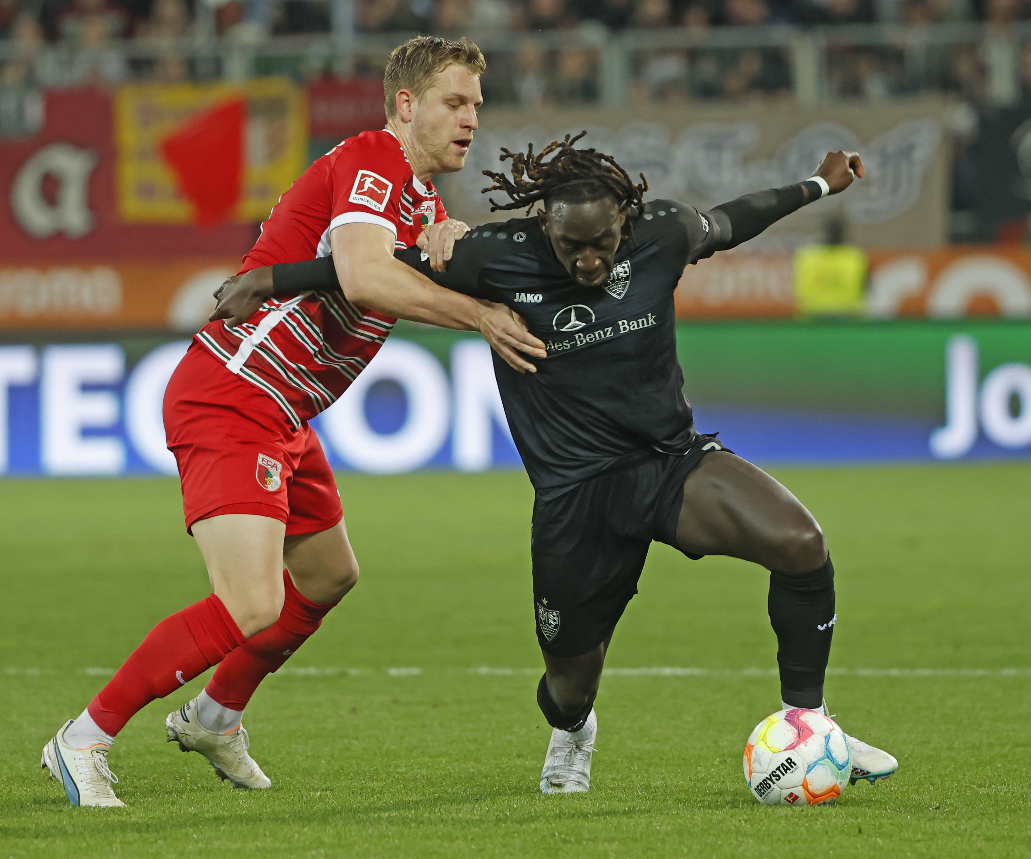 4月21日,奥格斯堡队球员雷克斯贝卡伊(左)在比赛中与斯图加特队球员吉拉西拼抢。新华社发(菲利普·鲁伊兹摄)