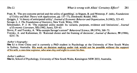 沈蕾丈夫李纾在自费读博的三年期间,约完成了6篇有关行为决策的期刊论文,并如愿将Journal of Behavioral Decision Making期刊选成了能发表他第1篇论文的期刊。选择这个期刊投稿的理由只有一个:在众多相关的SSCI或SCI期刊中,唯有这个期刊有要求作者写一个非常简短的“传记”(biography)。就为了让世人能够在白纸黑字的“传记”中看到以下两句话,他选择了将手稿投寄给JBDM期刊: