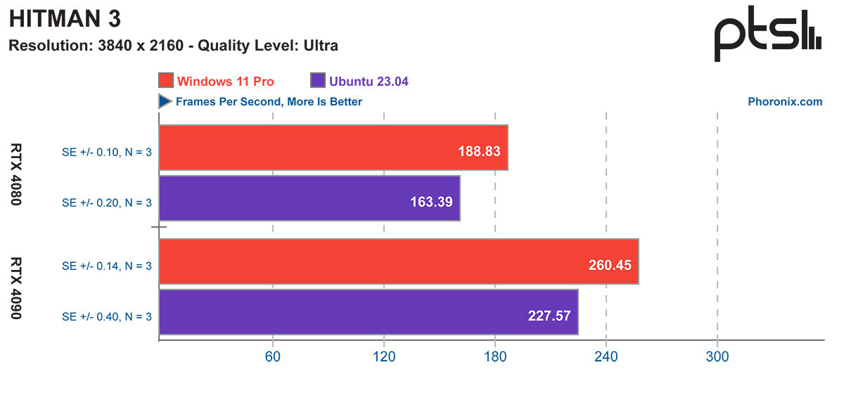 在2K分辨率最高画质设置下面,Linux相比Windows 11跑《赛博朋克2077》,用RTX 4090会差个12%,RTX 4080有15%,不过降低到高画质,RTX 4090的差距会缩小到5%,RTX 4080就保持15%的差距,而上到4K分辨率的表现和2K类似,不过phoronix并没有给出打开光追和DLSS方面的测试。《杀手3》的情况就飘忽一些,在2K分辨率最高画质下,两个操作系统的表现很接近,仅有5%差距,但开到4K超高画质,就最高能拉开到15%了。