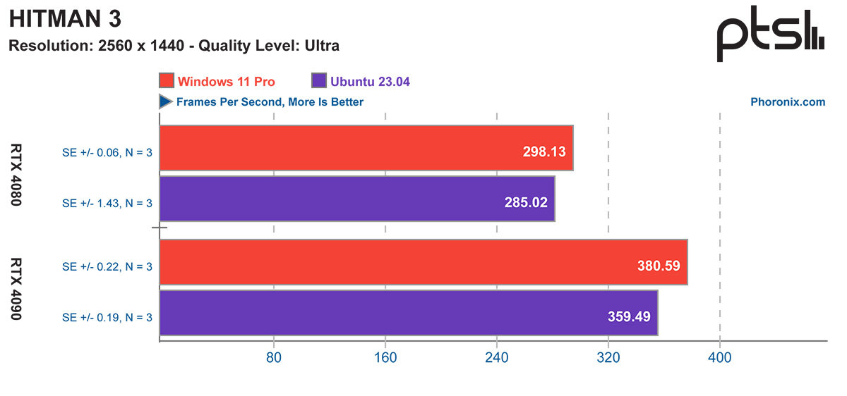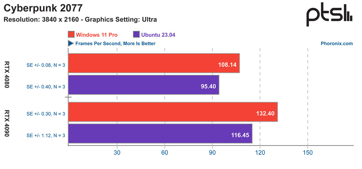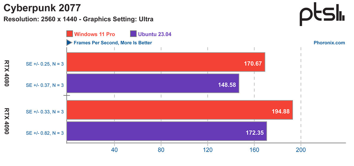 最近国外的一家网站phoronix,就做了个同显卡在Linux对比Windows 11的性能差距测试,他们用到NVIDIA最新一代的RTX 4080和RTX 4090,通过Steam Play(基于Proton)跑了《赛博朋克2077》和《杀手3》,尽管在Linux下面有从DirectX转到Vulkan的性能损失,但Proton的效率非常不错,Linux(Ubuntu 23.04)能达到Windows 11的大约90%的帧数水平