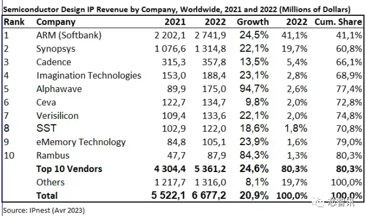 对于大多数IP供应商来说,2022年设计IP的主要趋势是非常积极的,尤其是前4名中的5家厂商:Arm、Synopsys、Imagination和Alphawave,他们的的增长幅度超过市场的平均增速(20.9%),分别为24.5%,22.1%,23.1%和94.7%。排名第三的Cadence的增速略低,为13.5%。