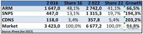 回顾2016-2022年IP市场演变可以带来有关主要趋势的有趣信息。全球半导体IP市场增长了94.8%,而前 3 名供应商的增长并不均衡。当排名第二的 Synopsys 增长 194% 和 Cadence(排名第三)增长 203% 时,排名第一的 Arm只增长了 66.5%。市场份额信息则更为重要,Arm 从 2016 年的 48.1% 上升到 2022年的41%,而Synopsys从13.1%上升到 22%,Cadence则 从 3.4% 上升到 5.4%。