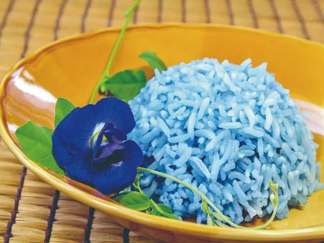 紫甘蓝、桑葚、蝶豆花等紫色食物富含花青素,将它们榨汁,加入碱性物质如小苏打等,花青素和碱性物质会发生化学反应变成蓝色,用这些蓝色汁液煮饭或调制饮料,就能得到蓝色的食物了。
