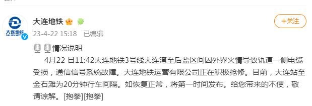 4月22 日11:42大连地铁3号线大连湾至后盐区间因外界火情导致轨道一侧电缆受损,通信信号系统故障。大连地铁运营有限公司正在积极抢修。目前,大连站至金石滩为20分钟行车间隔。如恢复正常,将第一时间发布。给您带来的不便,敬请谅解。