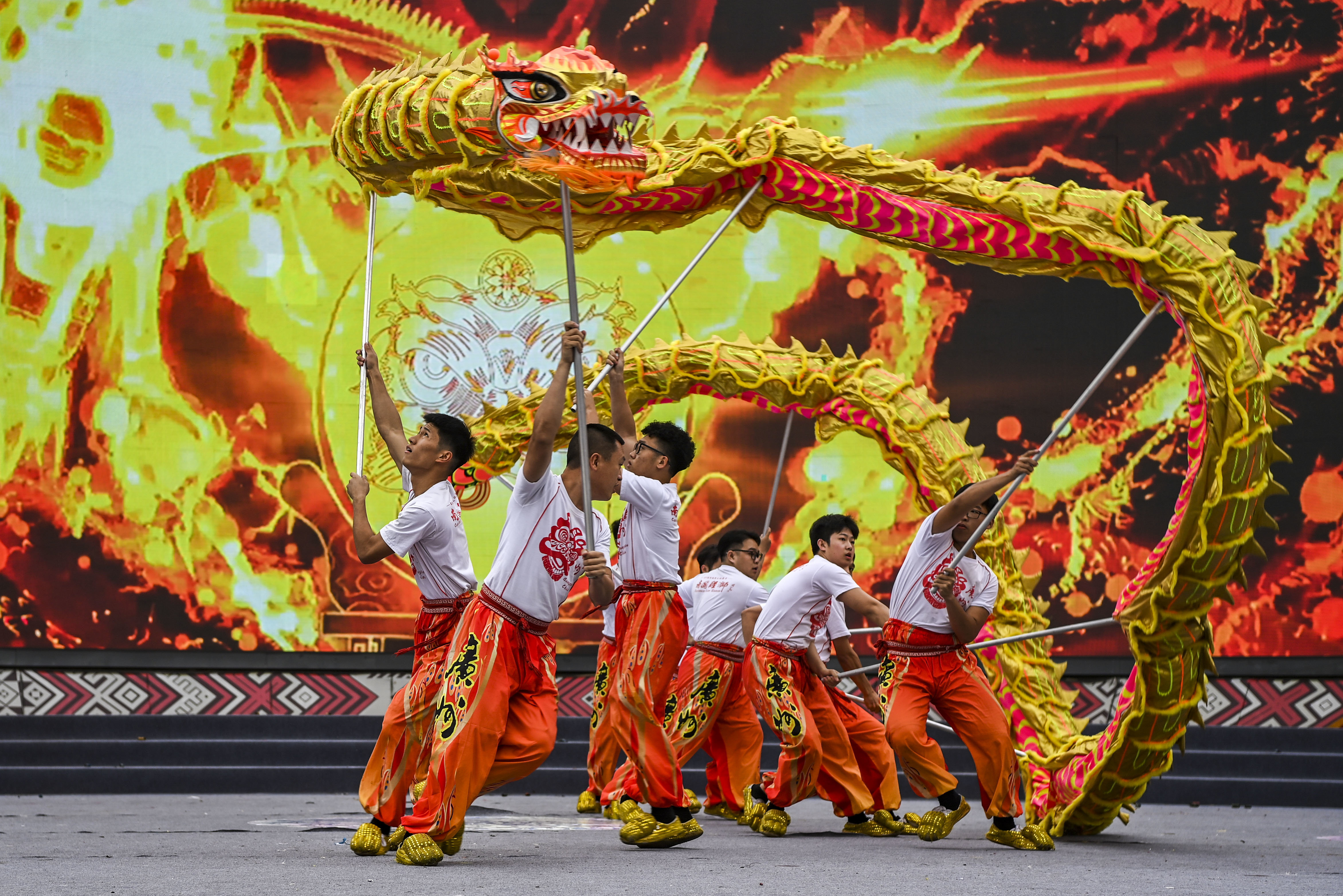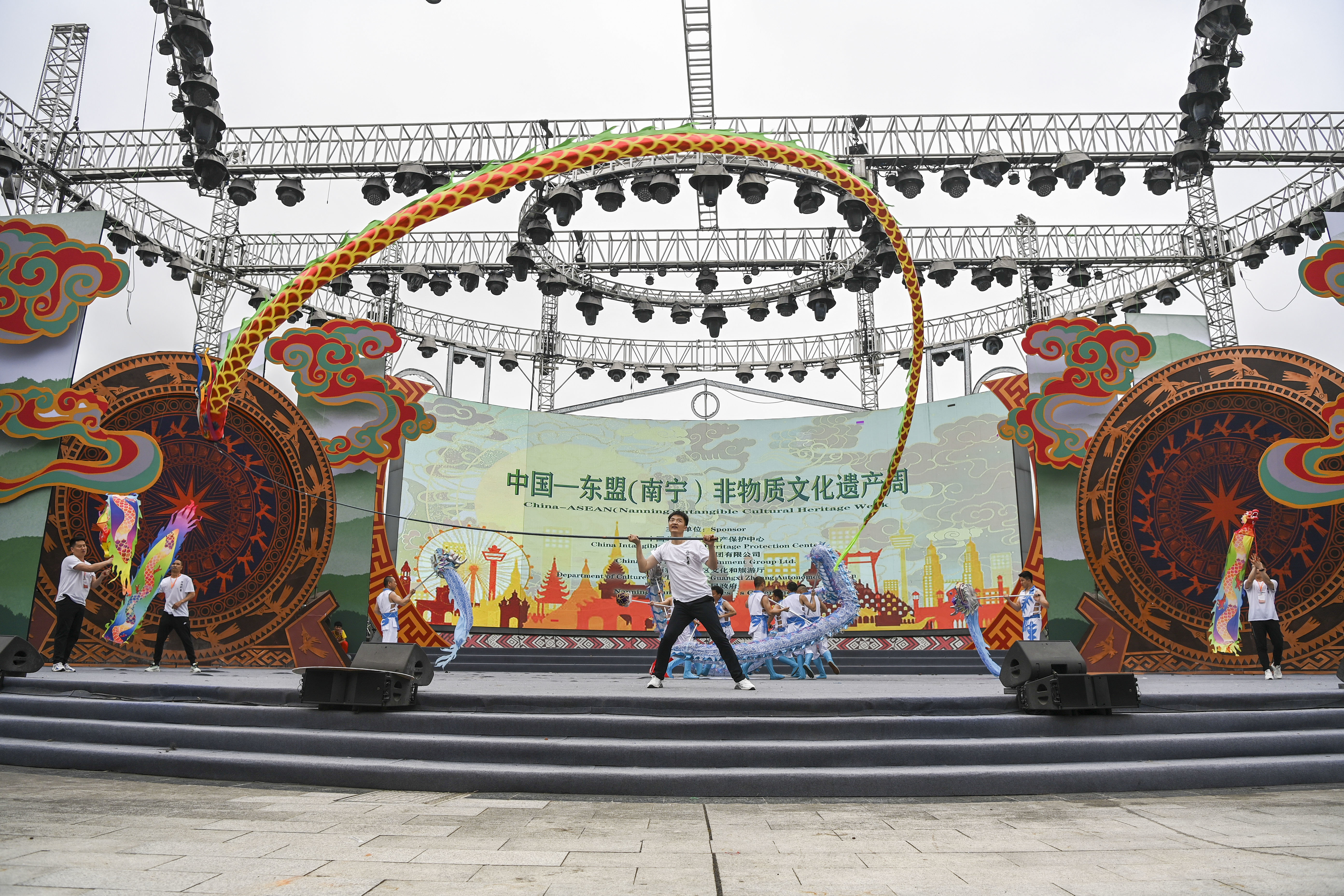 4月22日,在中国—东盟(南宁)非物质文化遗产周开幕现场,演员在表演舞龙。新华社记者 曹祎铭 摄