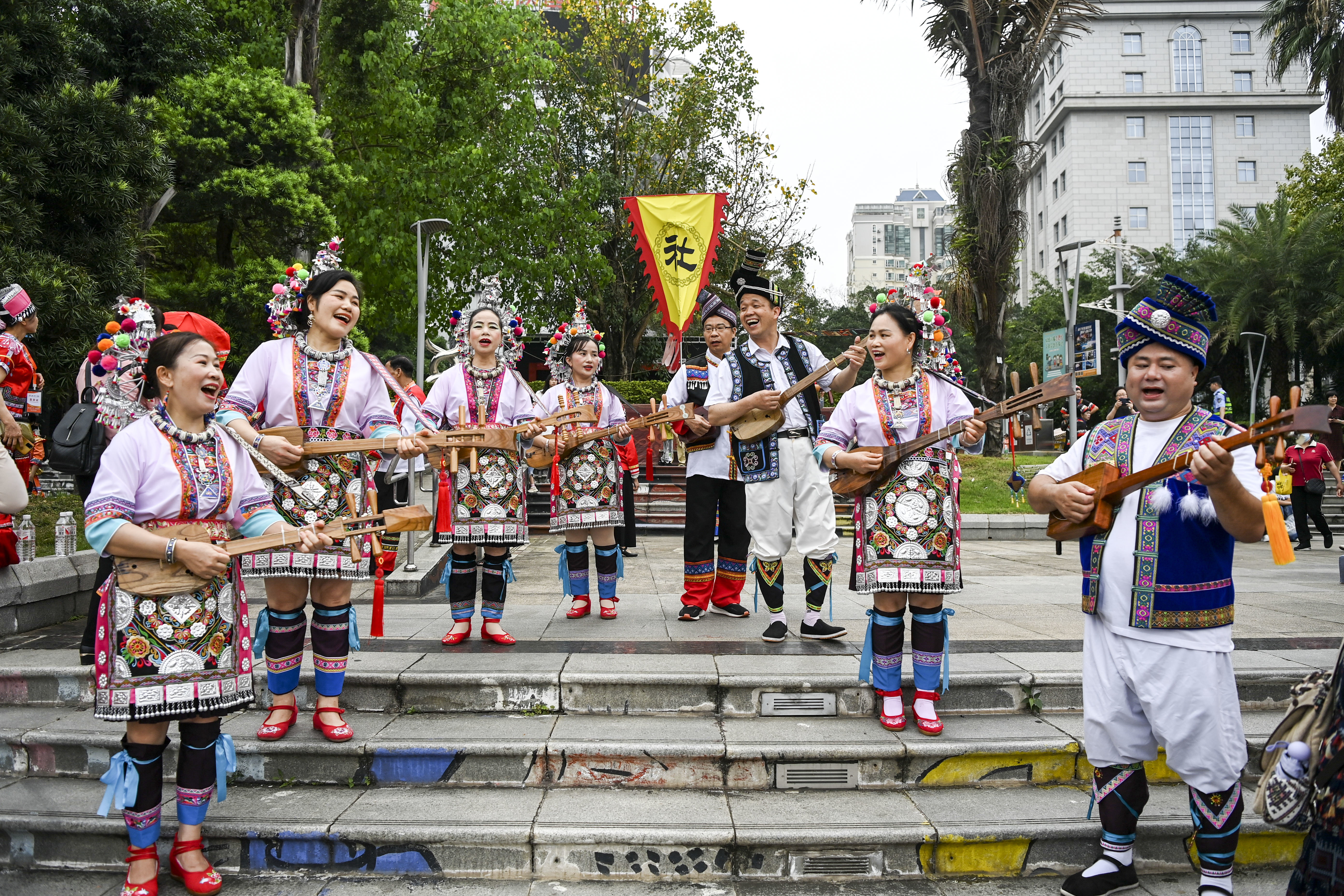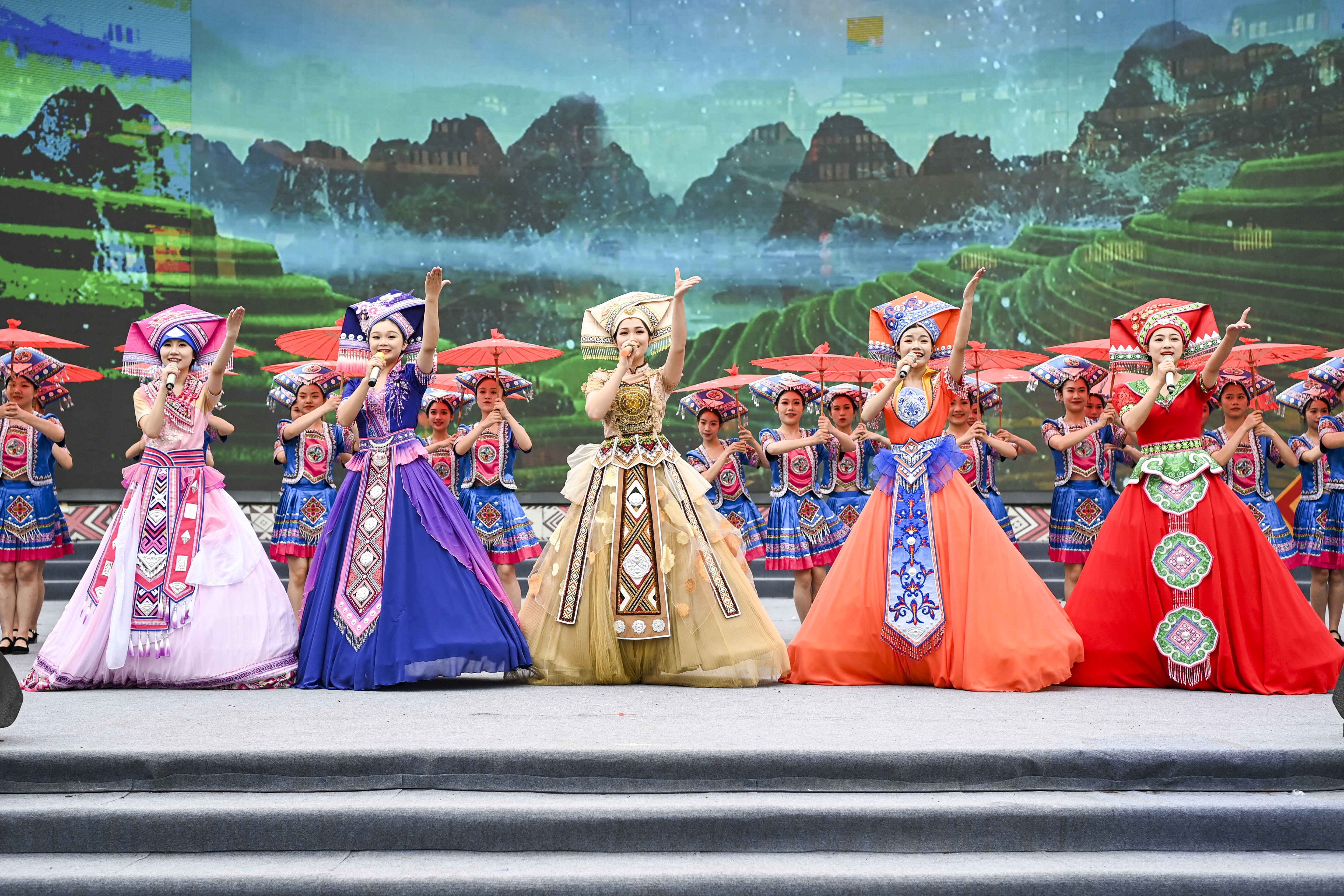 4月22日,在中国—东盟(南宁)非物质文化遗产周开幕现场,演员在表演少数民族歌舞。新华社记者 曹祎铭 摄