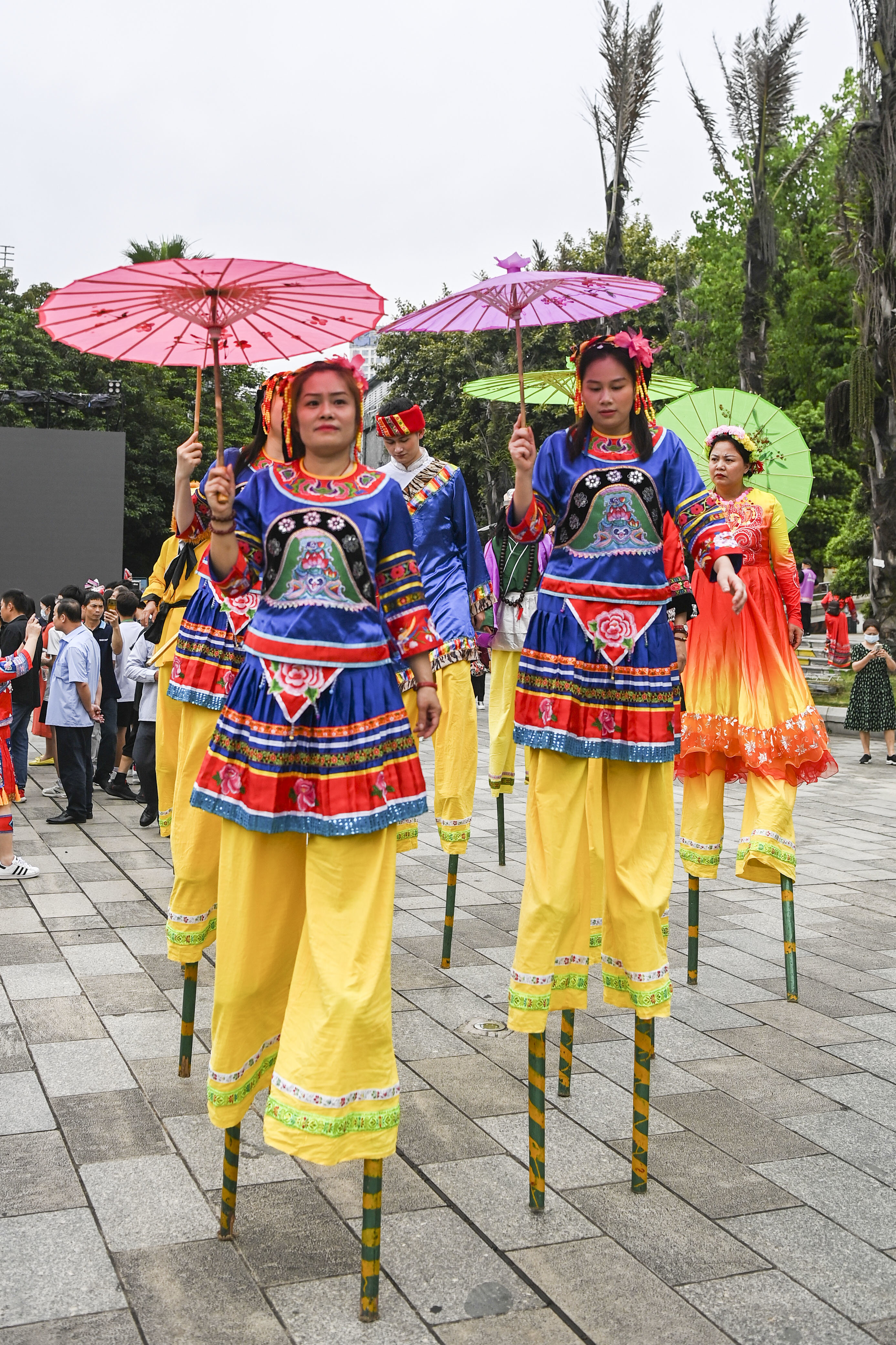 4月22日,在中国—东盟(南宁)非物质文化遗产周开幕现场,演员在表演踩高跷。新华社记者 曹祎铭 摄