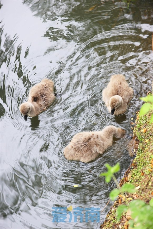 刚出壳的幼雏羽毛呈浅灰色,胎绒羽湿润。小宝宝们跟随父母或在湖中觅食、戏水,或爬到父母的背上休息,一家五口尽享天伦之乐,成为春天里一道可爱有趣的风景,吸引众多游客驻足围观拍照。