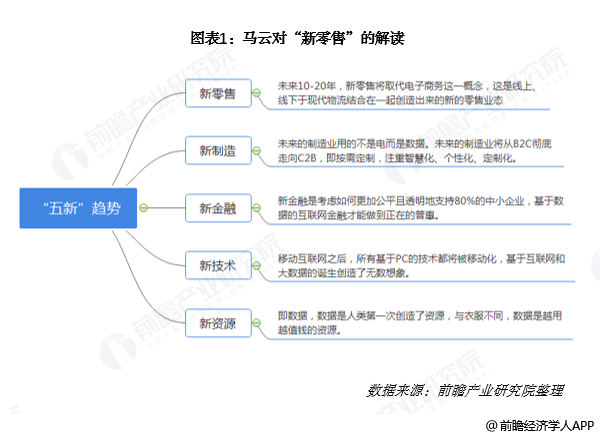 2016年10月,在阿里云栖大会上,马云在其演讲中提出未来五大新趋势:新零售、新制造、新金融、新技术与新能源,并称未来这五个新的发展将会深刻地影响到中国、世界及未来的所有人。其中就第一个新——新零售,他认为:纯电商时代已经过去,未来十年、二十年没有电子商务这一说,只有新零售这一说,也就是说线上线下和物流必须结合在一起,才能诞生真正的新零售。