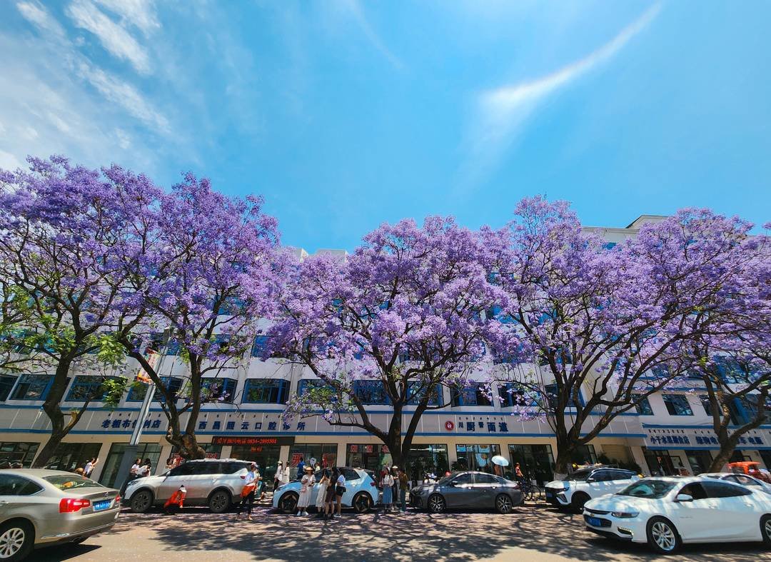 蓝花楹是西昌市的市树。1994年,被称为西昌“蓝花楹之父”的那剑新,从泸州引进了一批蓝花楹树苗,种在了航天北路。29年过去,这批蓝花楹已经长成米径超过70厘米的大树,航天北路也成为了西昌4月最具人气的网红打卡地。