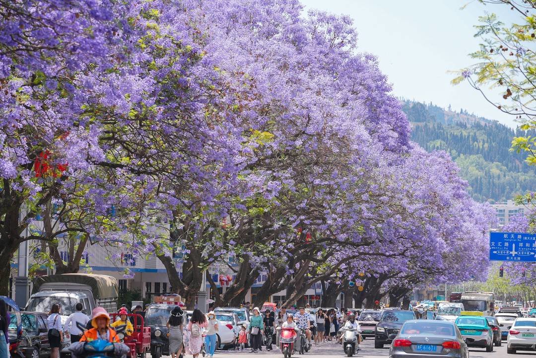 每年4月的中下旬,是四川凉山州西昌市蓝花楹的盛开时节。这是西昌的专属浪漫:在城区航天北路、健康路、建昌路等地,正在怒放的蓝花楹,将整座城市开成了紫色花海。