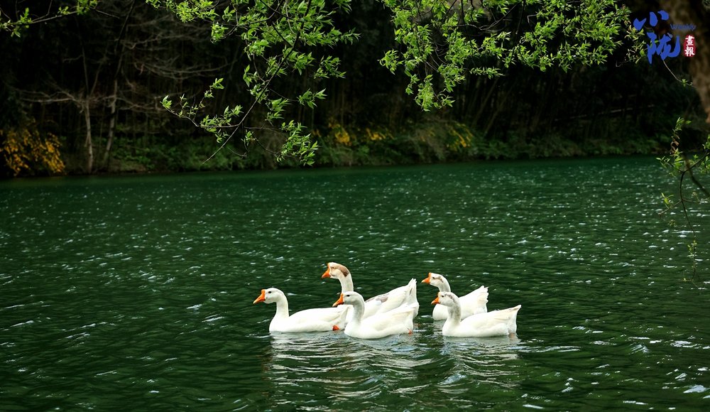 一群群鸭子在清澈的溪水中嬉戏,络绎不绝的游人无不沉醉在山水之中。