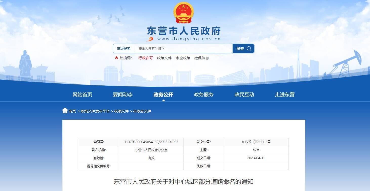 齐鲁网·闪电新闻4月23日讯 为规范东营市中心城区道路名称,方便广大市民工作和生活,根据《地名管理条例》(国务院令第753号)有关规定,东营市政府确定对中心城区116条道路命名,现公布如下: