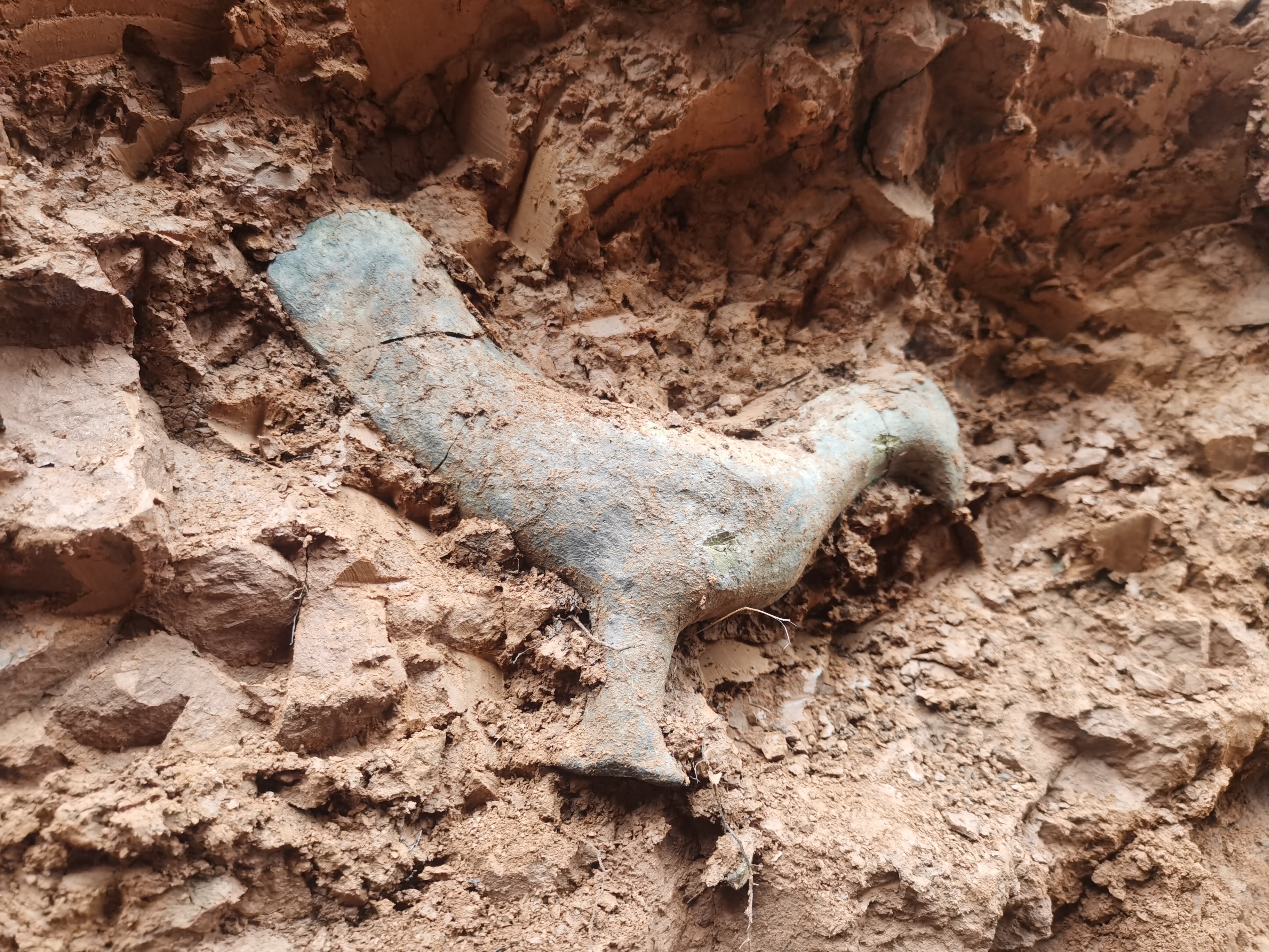 视频显示,在一处乡村里的施工现场,有一个嵌在泥土里的青绿色鸟状物,有网友表示这可能是文物。该鸟状物看起来很精致,也很完整。