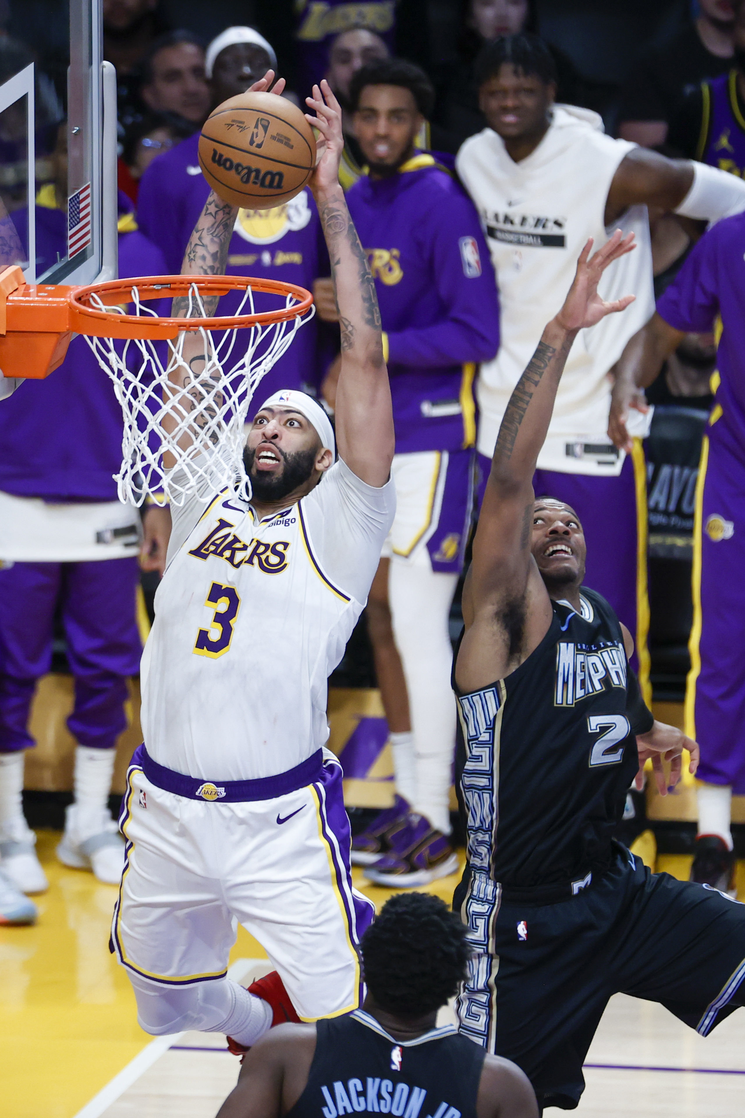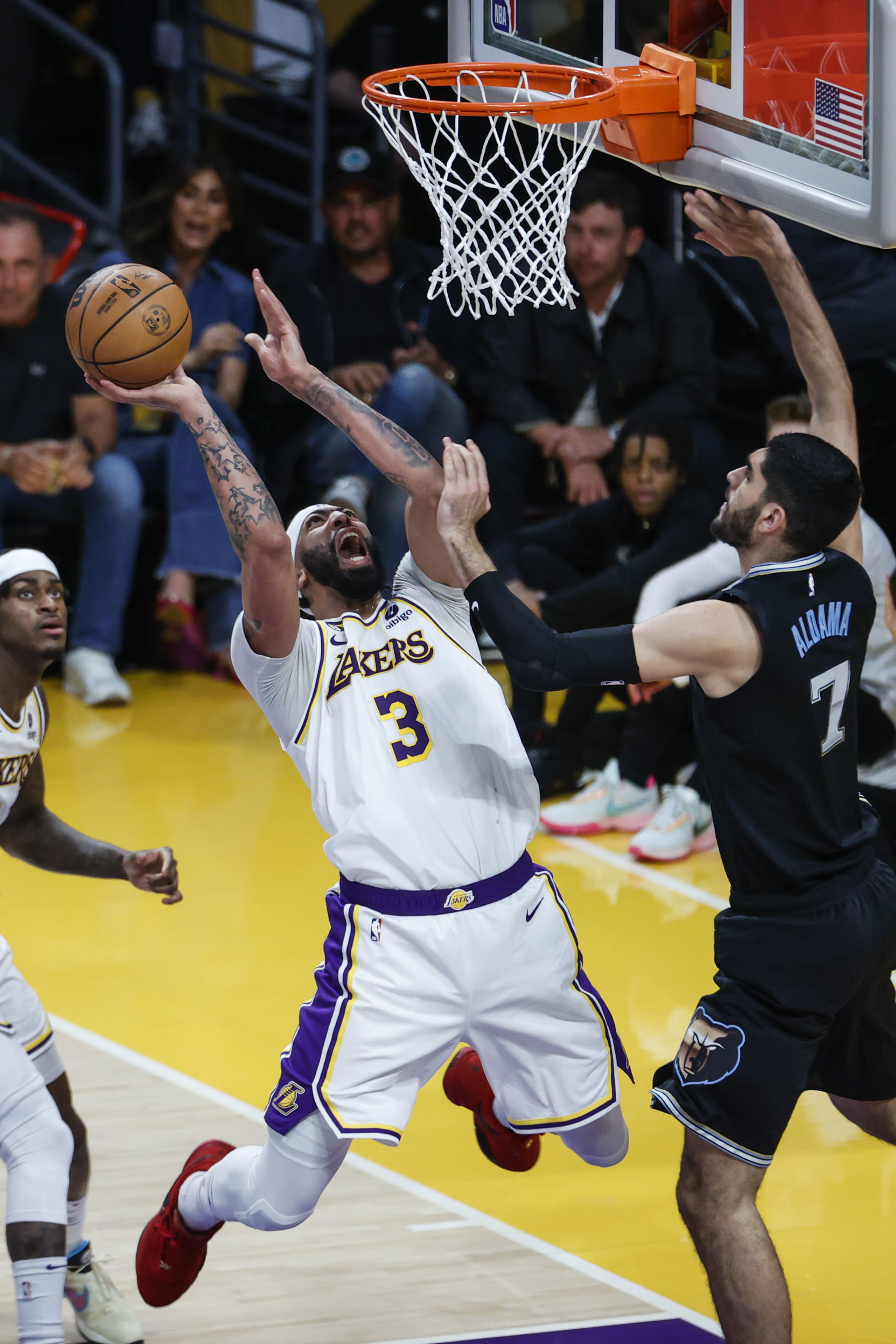 4月22日,湖人队球员安东尼·戴维斯(左)封盖灰熊队球员贾·莫兰特。新华社发(赵汉荣摄)