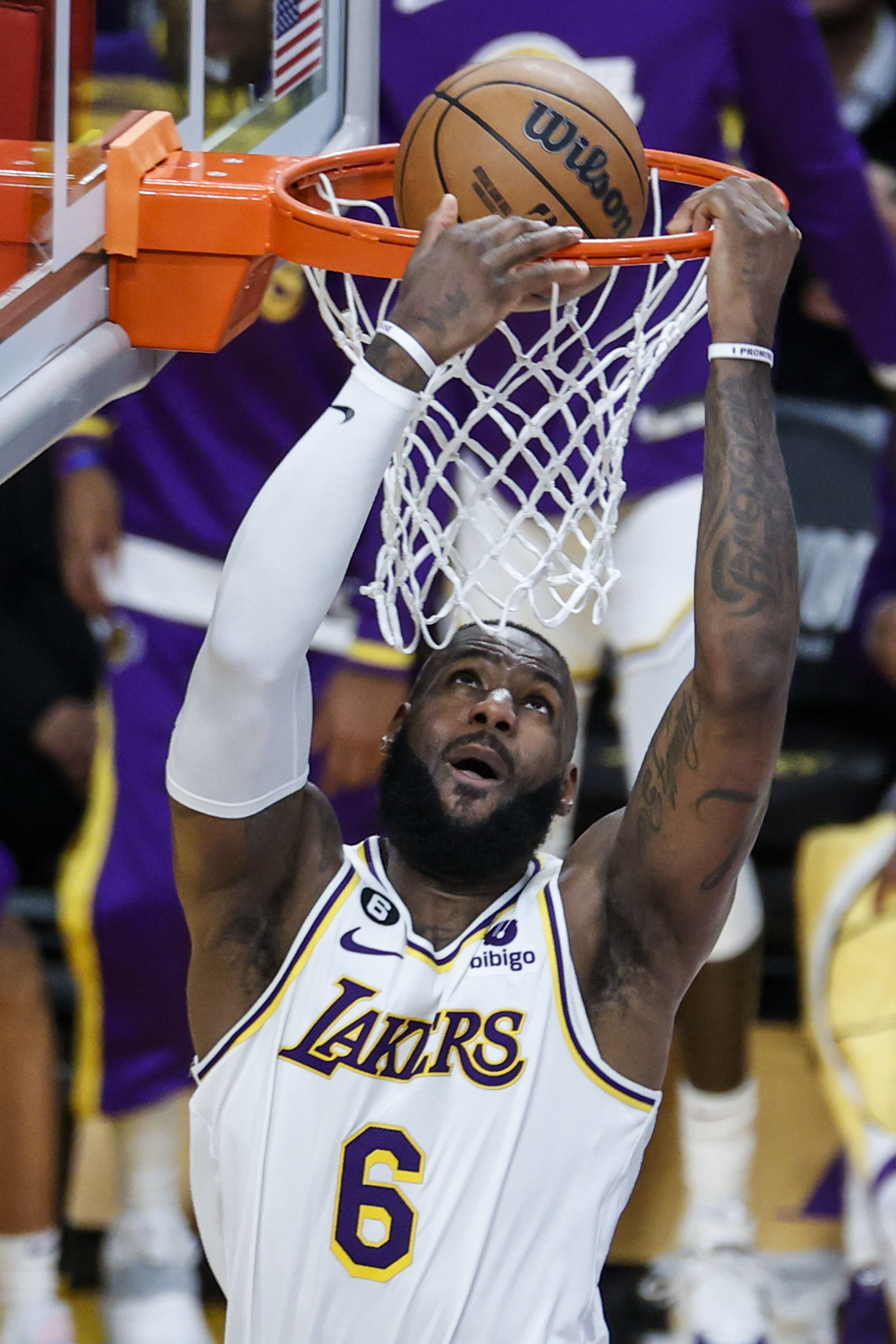 4月22日,湖人队球员勒布朗·詹姆斯在比赛中扣篮。新华社发(赵汉荣摄)